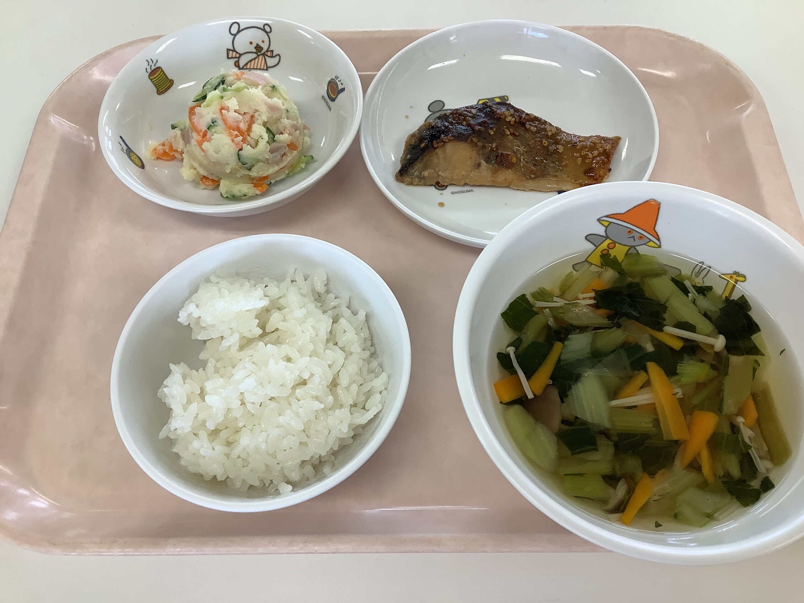 〈給食〉あじのごまみそ焼き,ポテトサラダ、ごはん、きのこのすまし汁。