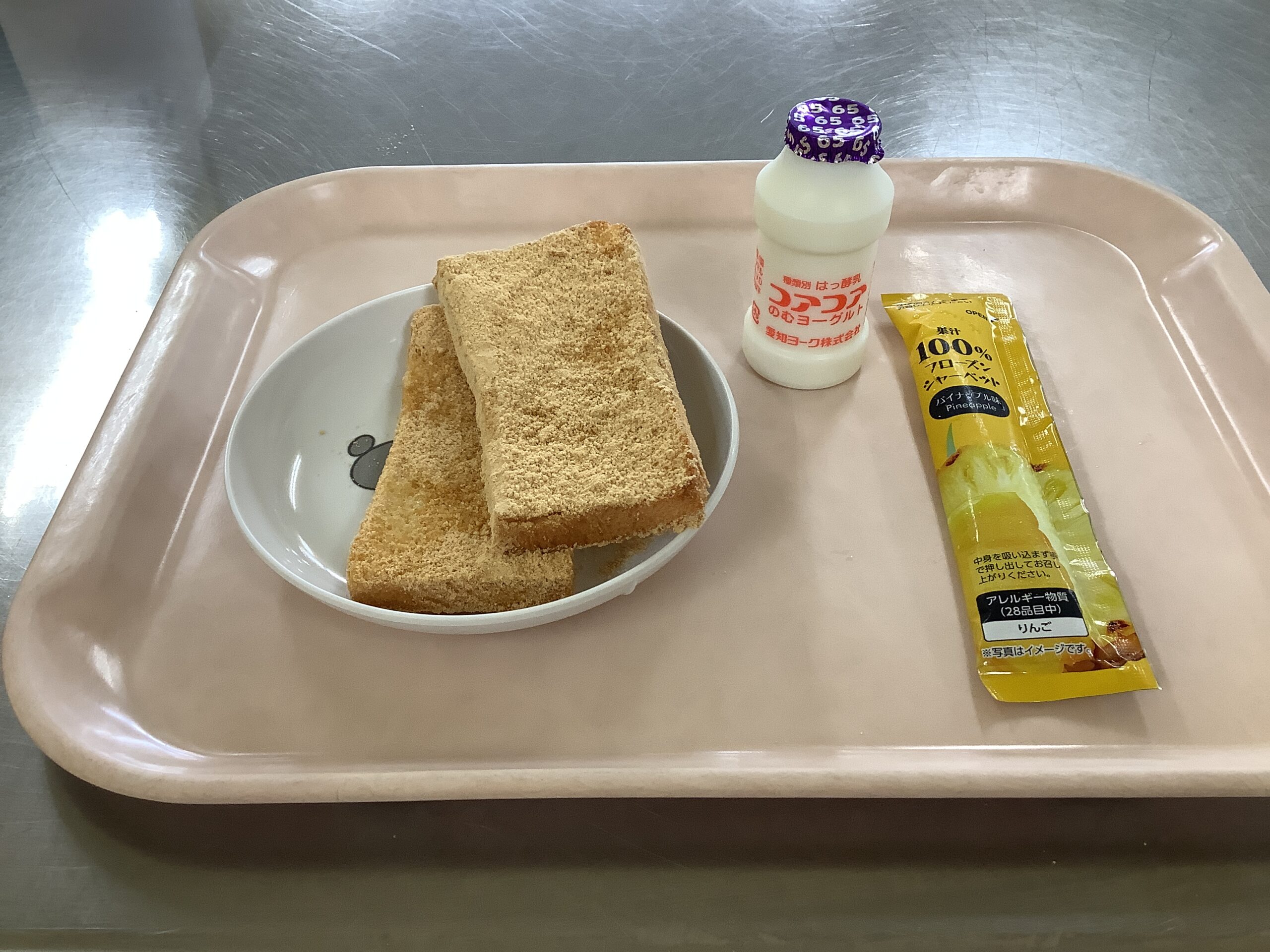 〈午後のおやつ〉きなこトースト、コアコア飲むヨーグルト。
