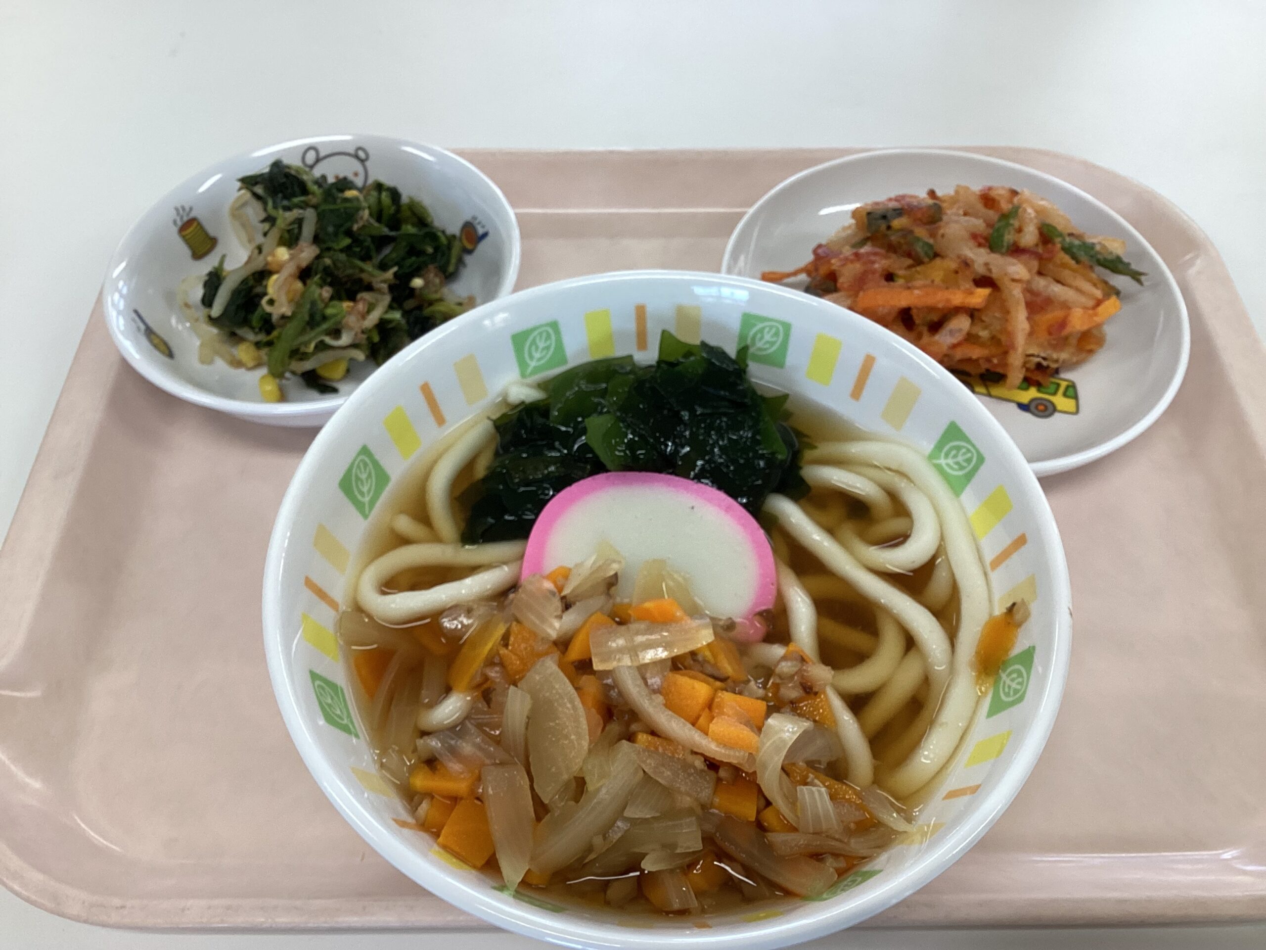 〈給食〉わかめうどん、手作りかき揚げ、ほうれん草のおかか和え。