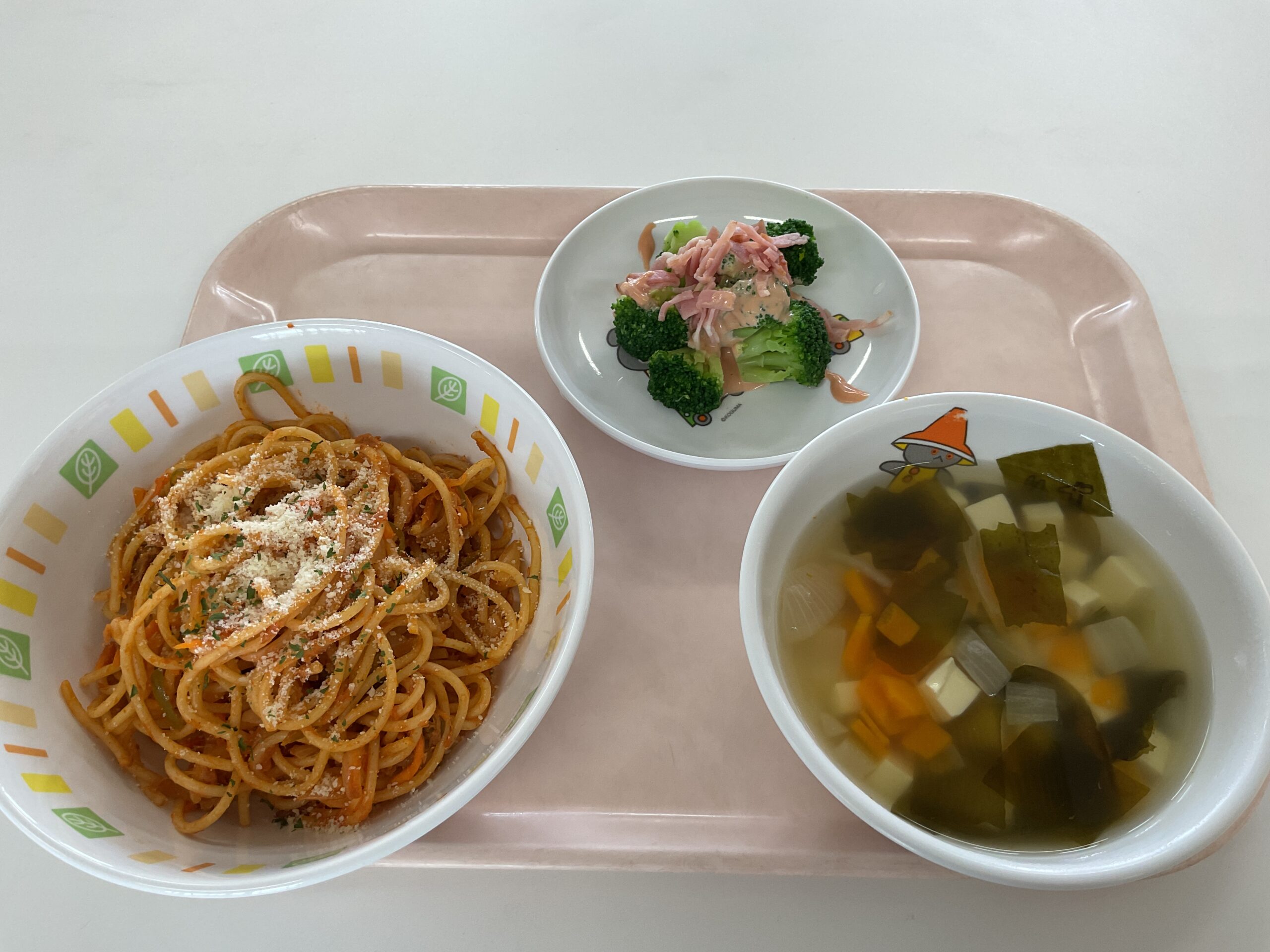 〈給食〉ツナトマトスパゲッティ、ブロッコリーのオーロラソースかけ、とうふスープ。
