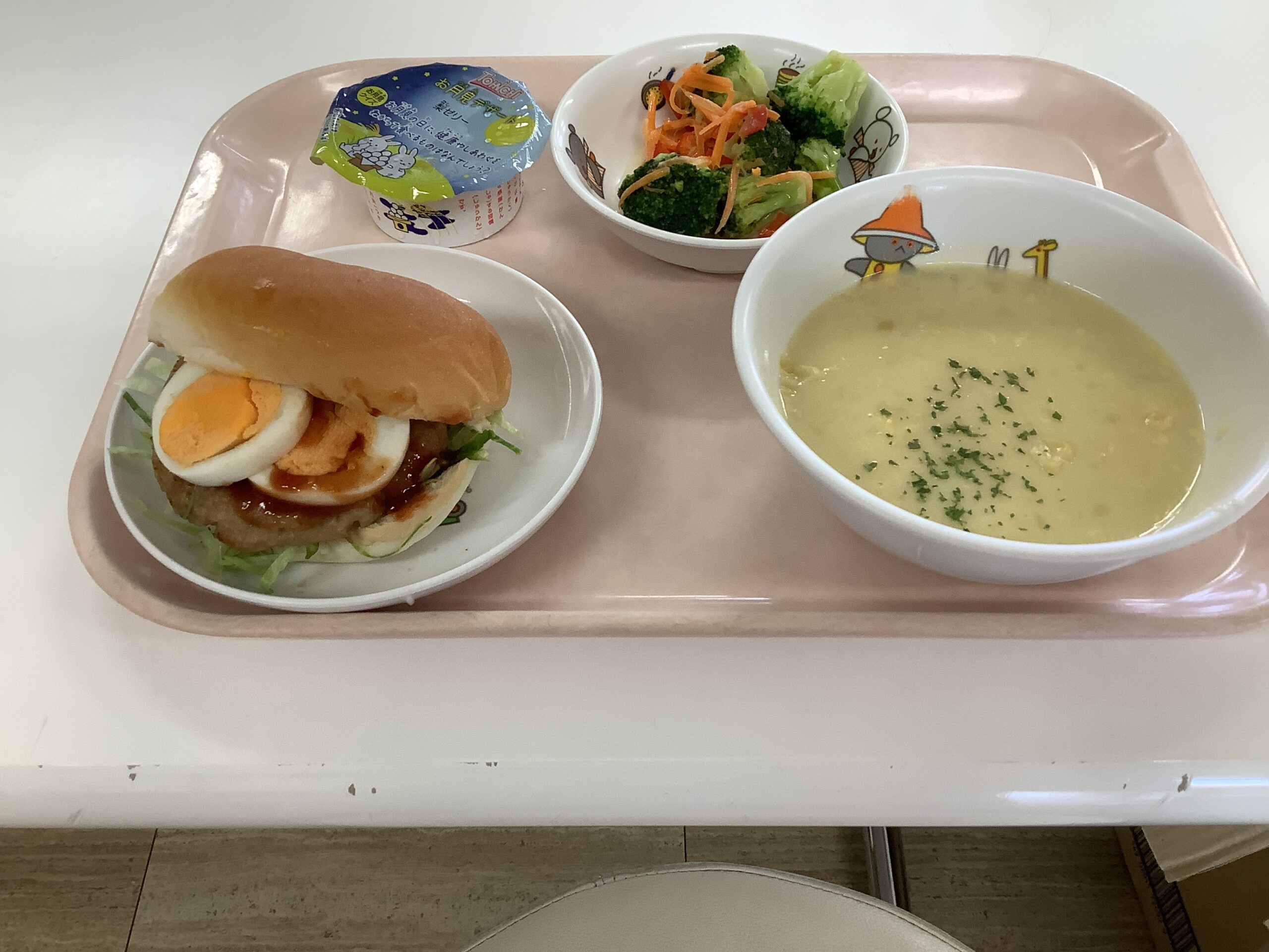 〈給食〉お月見バーガー、ブロッコリーのサラダ、コーンスープ、お月見ゼリー。
