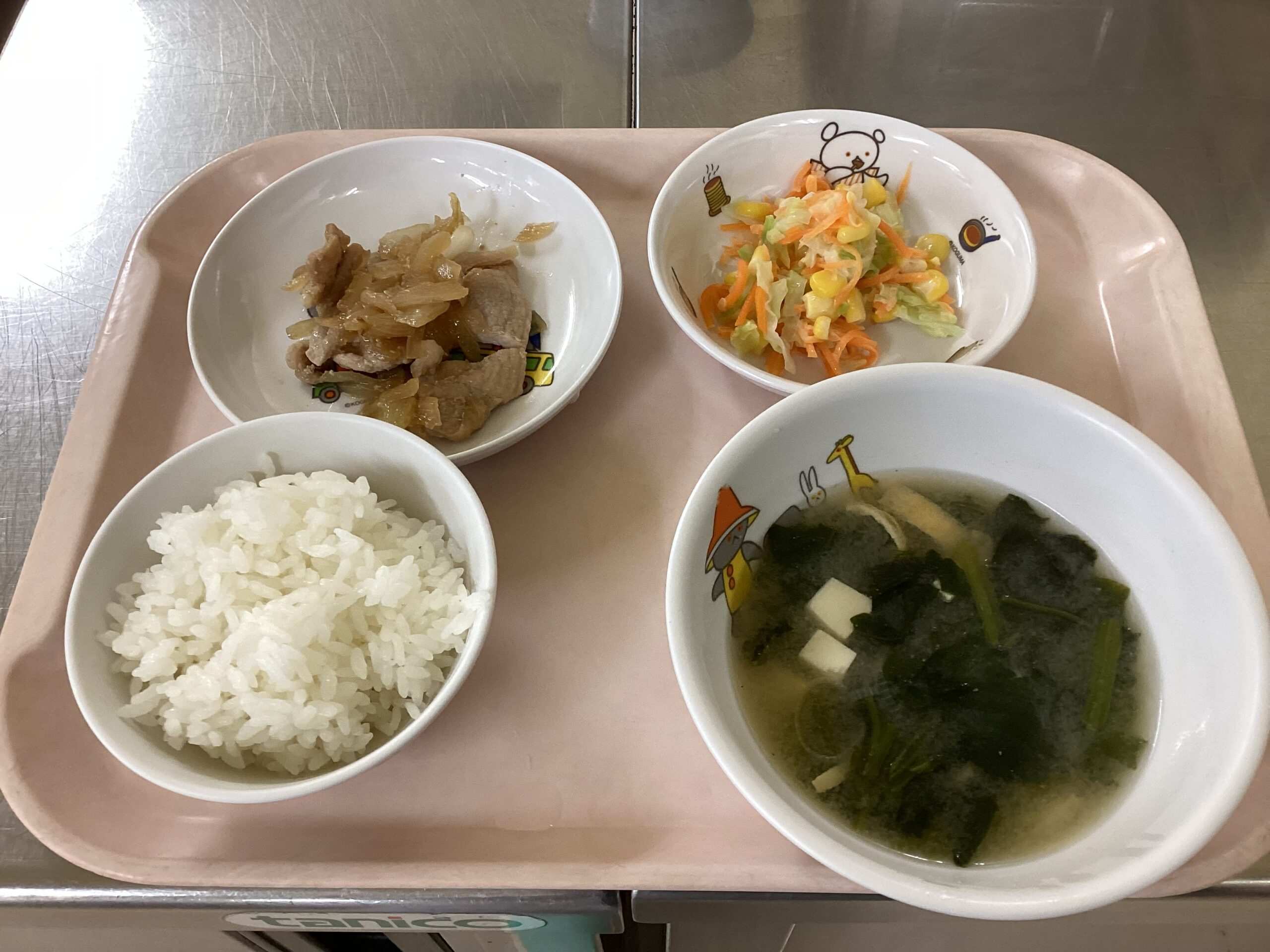 〈給食〉豚肉のしょうが焼き、ごはん、キャベツのサラダ、ほうれん草のみそ汁。