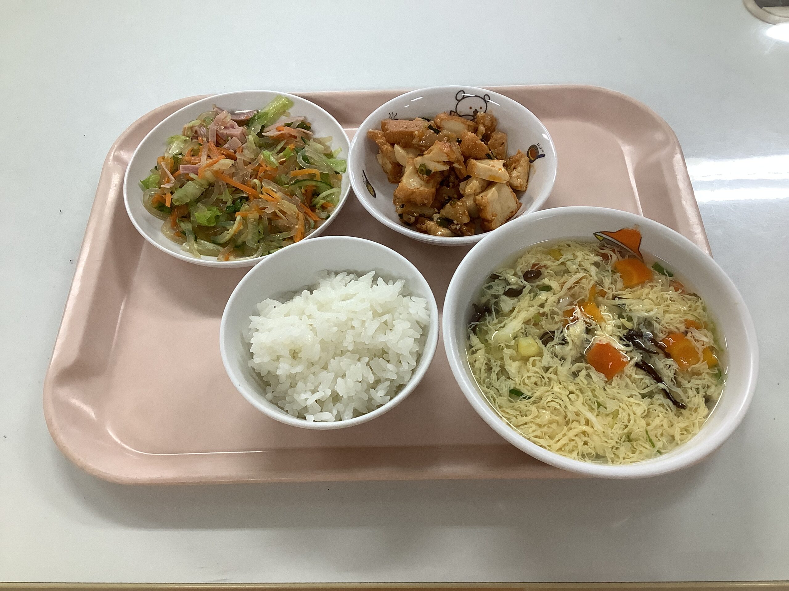 〈給食〉ヤンニョム厚揚げ、ごはん、春雨サラダ、中華風コーンスープ。