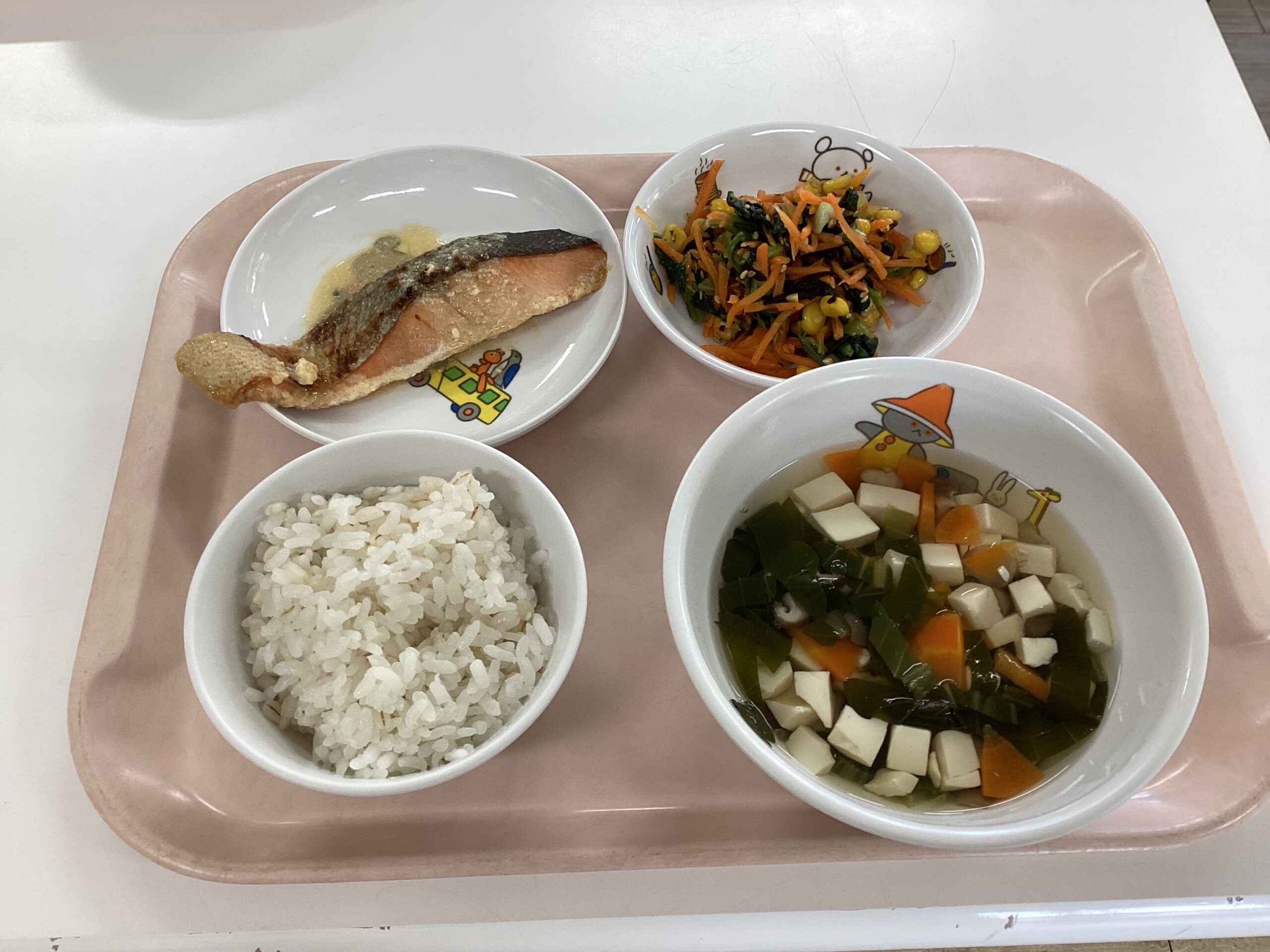 〈給食〉サケのみそマヨ焼き、麦ごはん、小松菜とひじきの和えもの、チンゲンサイととうふのすまし汁。