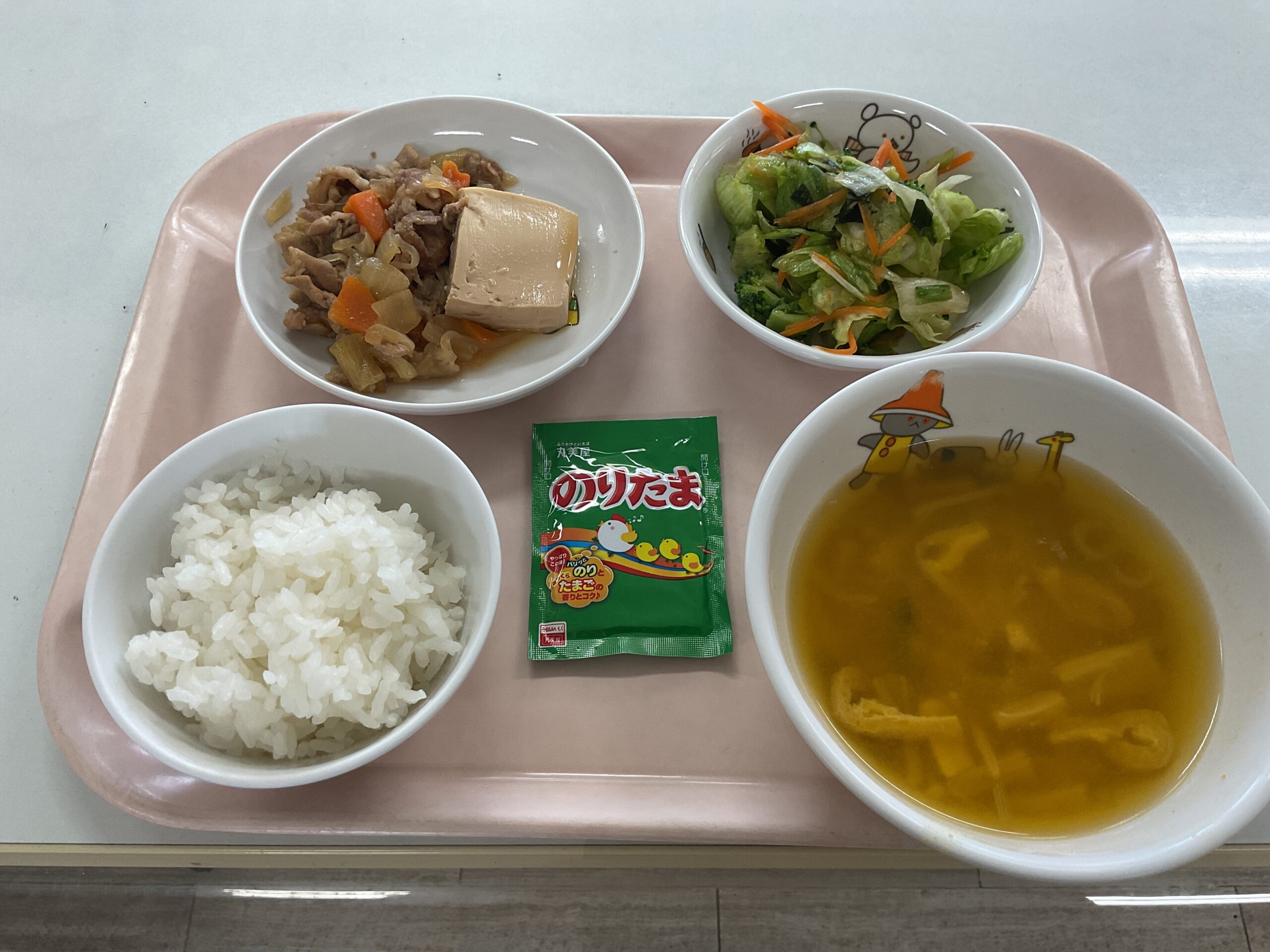 〈給食〉肉豆腐、ごはん、のりたま、和風サラダ、かぼちゃのみそ汁。