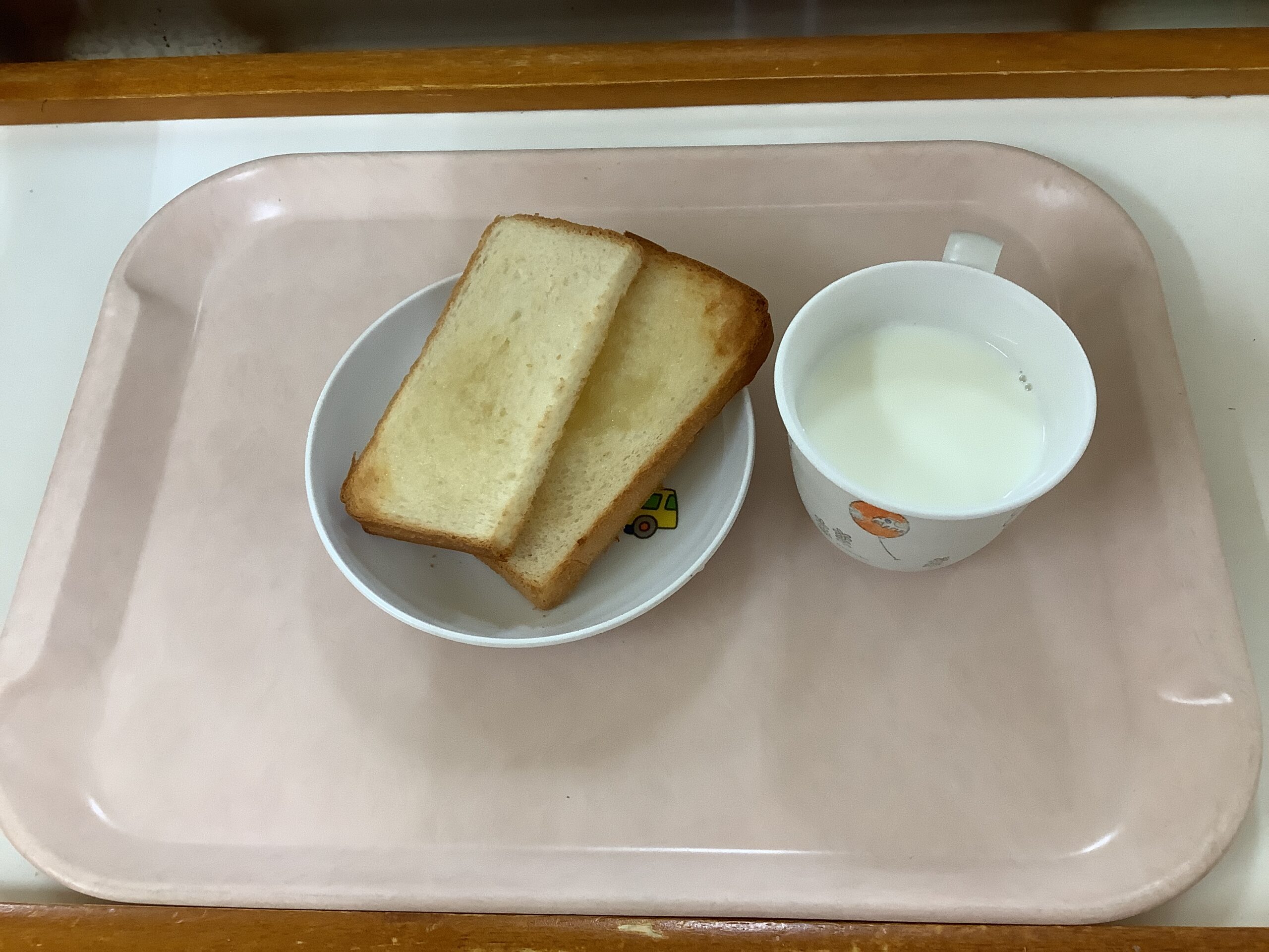 〈給食〉厚揚げのチリソース和え、麦ごはん、小松菜のごま酢和え、じゃがいものみそ汁。