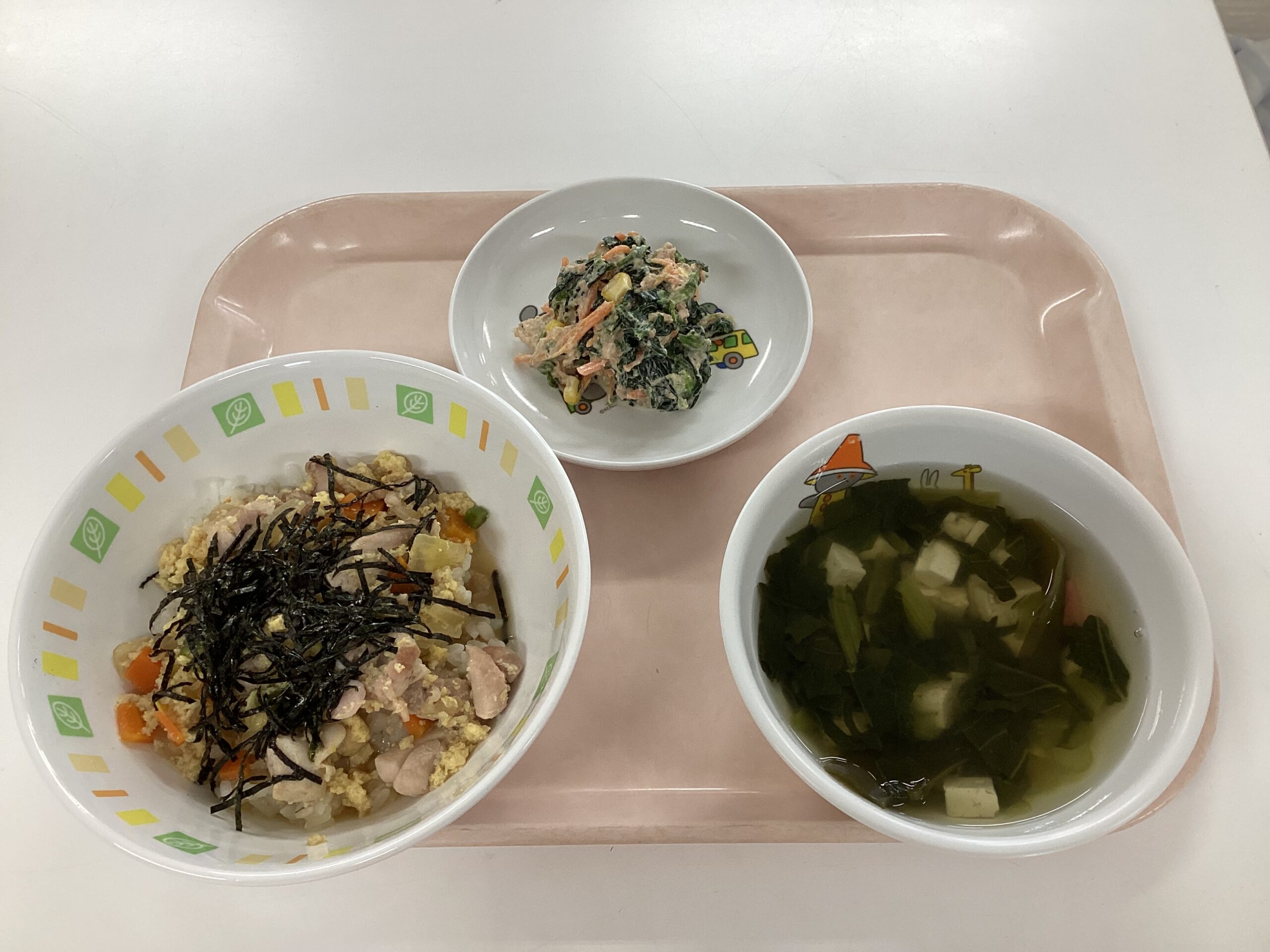 〈給食〉親子丼(麦ごはん)、ほうれん草とツナのサラダ、とうふのすまし汁。