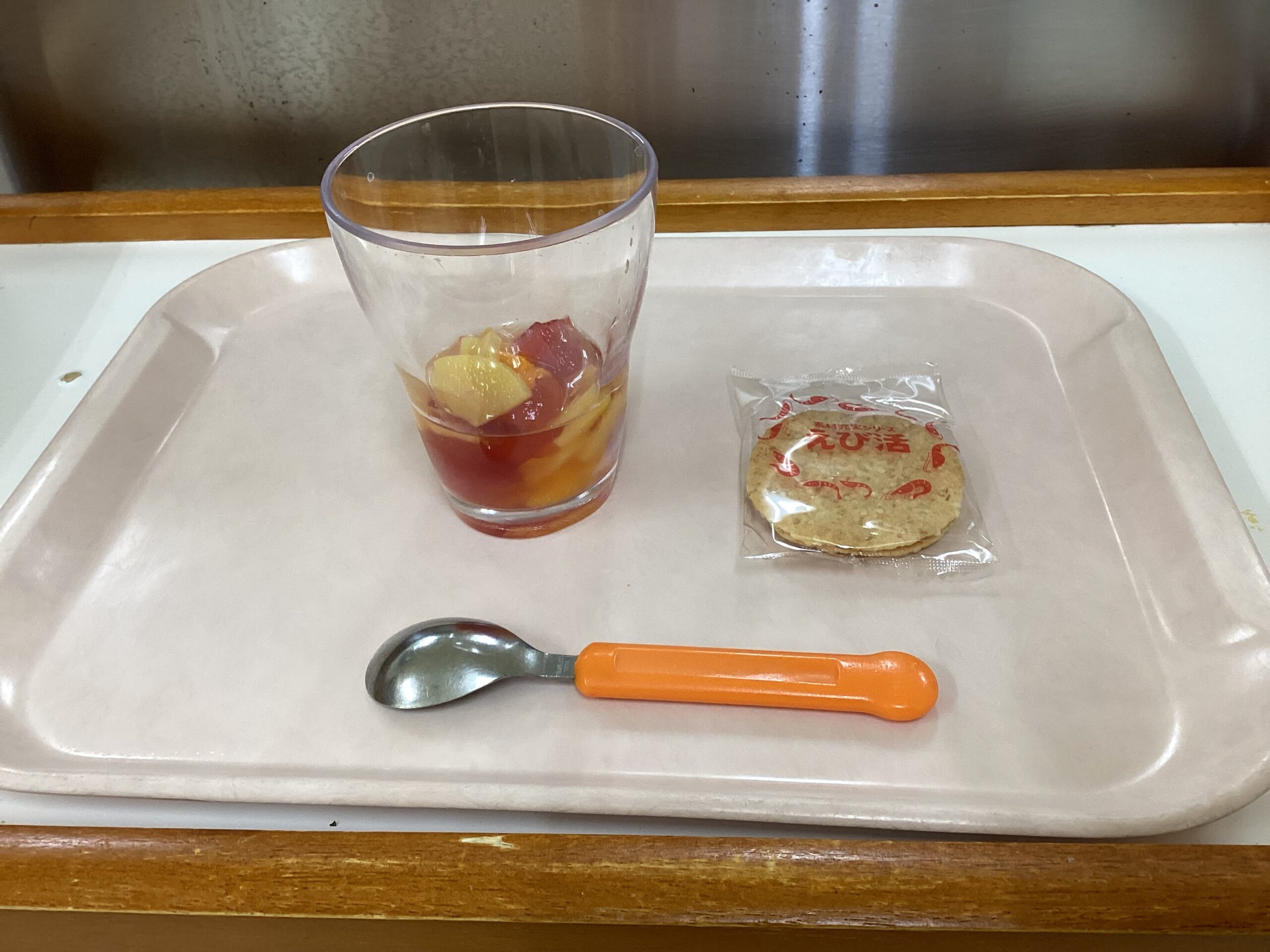 〈午後のおやつ〉フルーツポンチ、せんべい(えび活)。