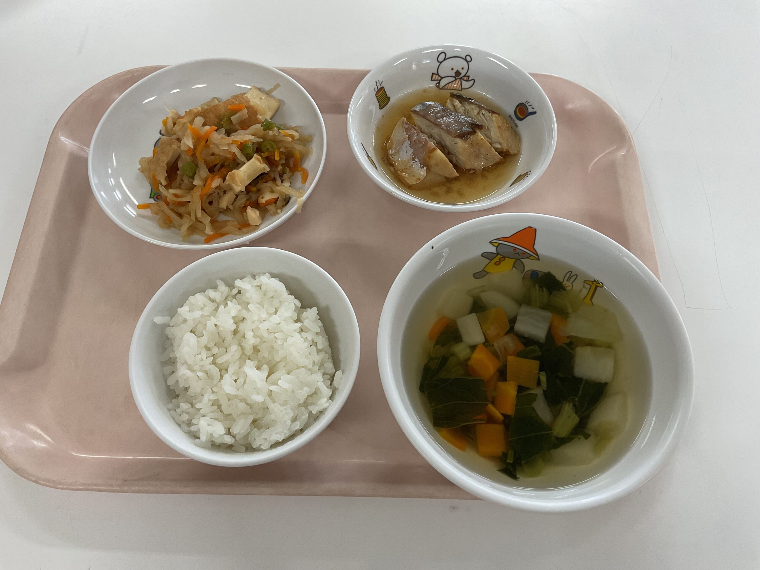 〈給食〉さばのしょうゆ煮、ごはん、切り干し大根の煮物、かぶのすまし汁。