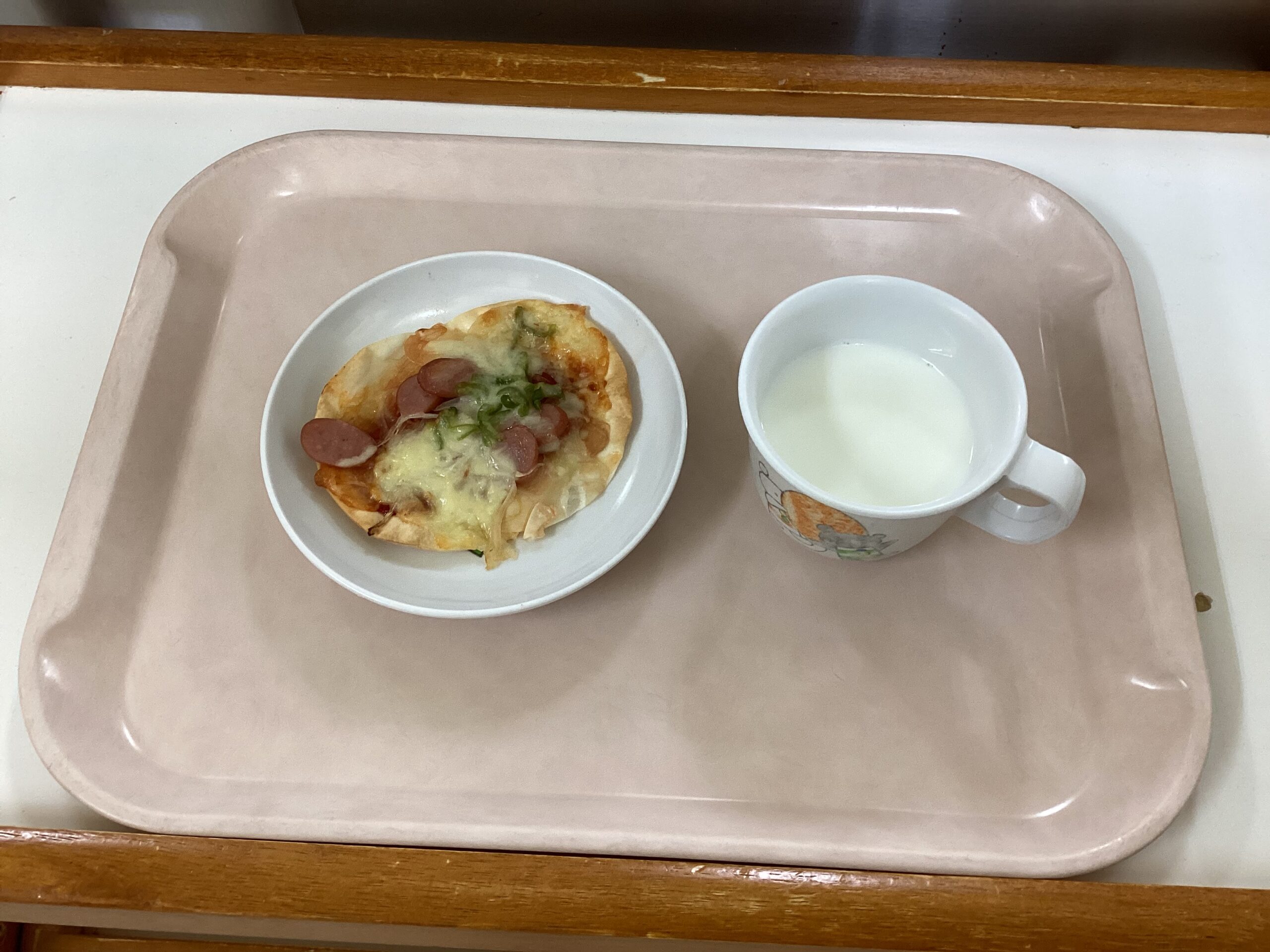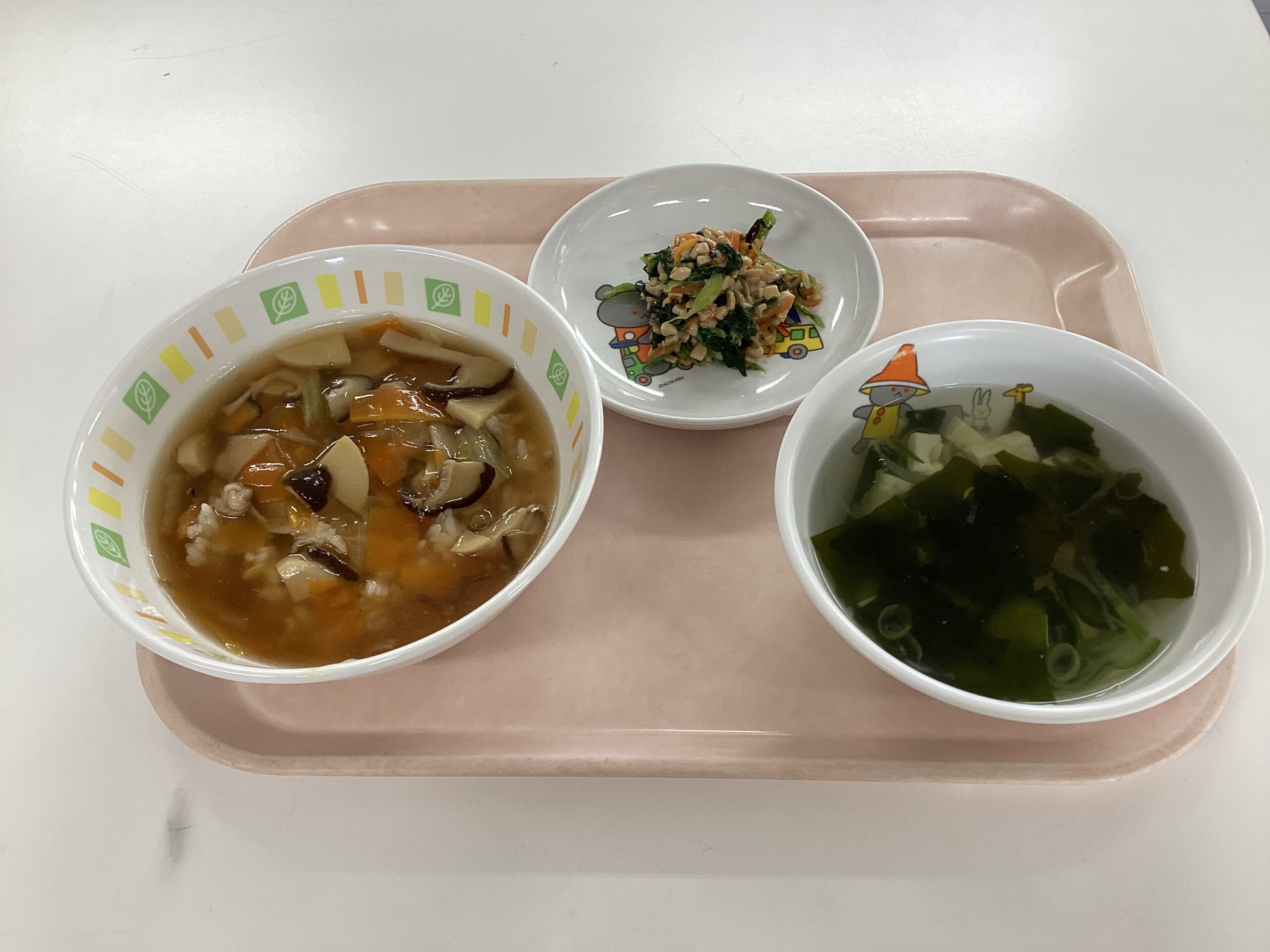 〈給食〉中華丼、小松菜の納豆和え、豆腐のスープ。