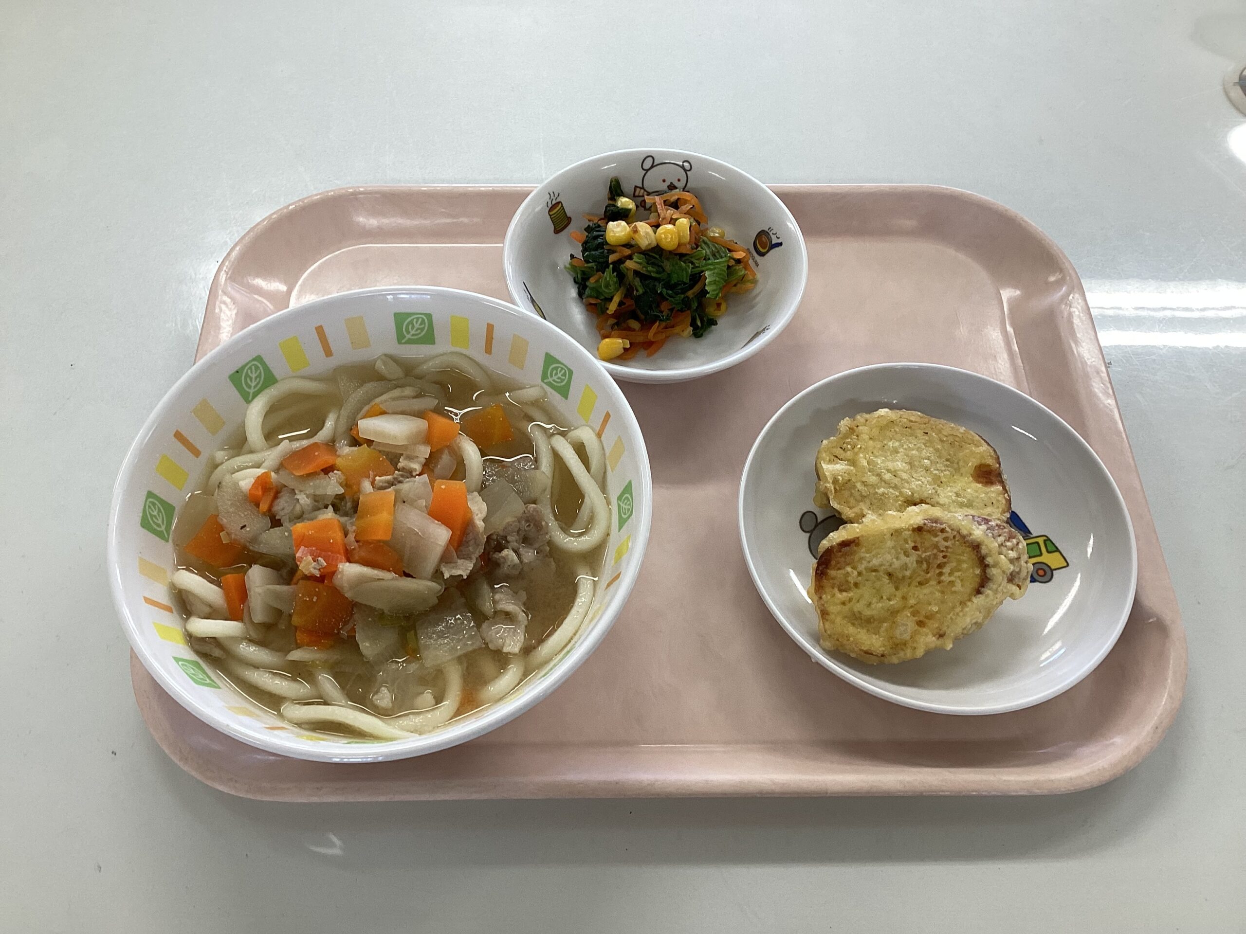 〈給食〉豚汁うどん、さつまいもの天ぷら、ほうれん草のおかか和え。