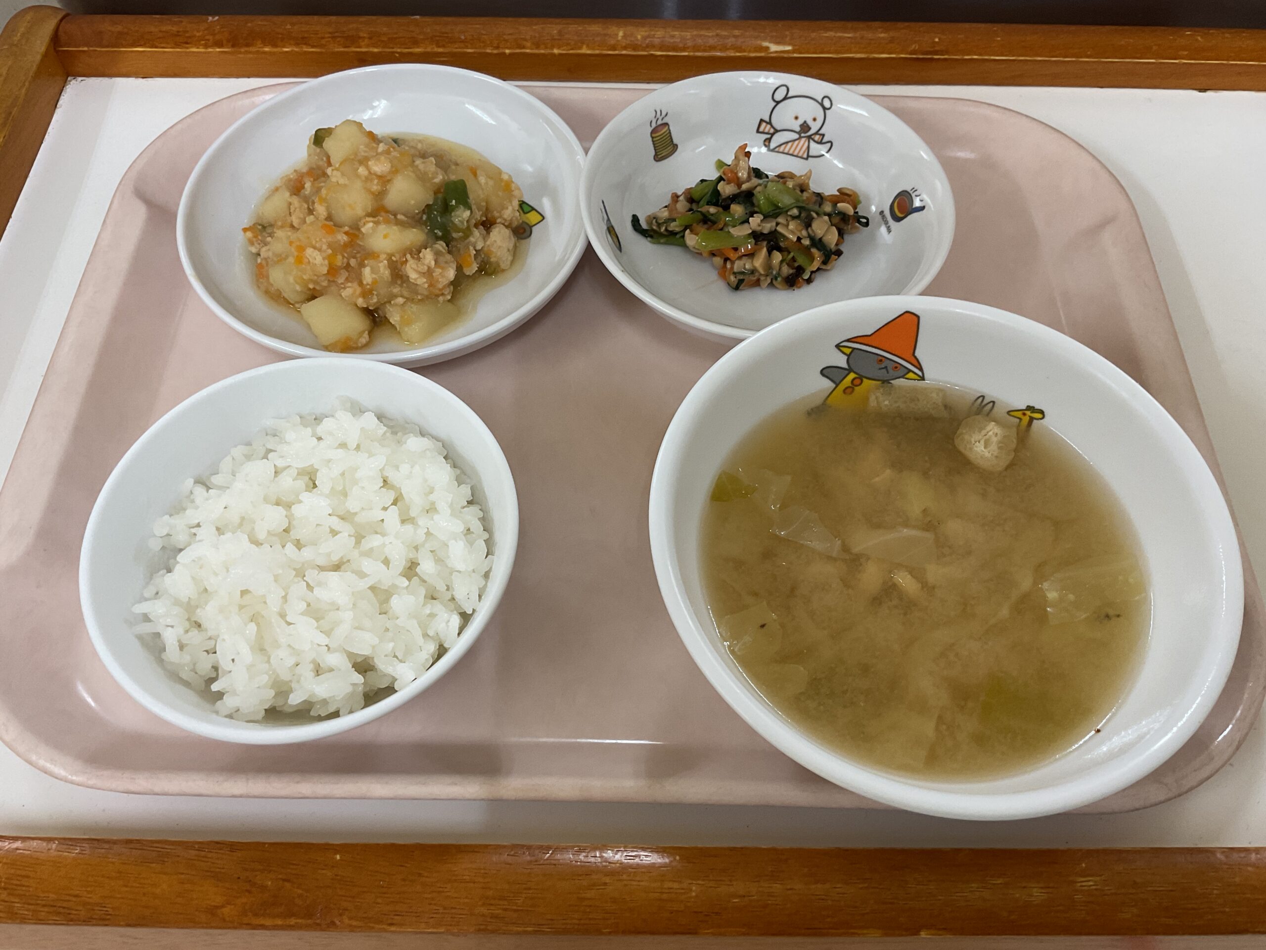 〈給食〉じゃがいものそぼろ煮、ごはん、小松菜の納豆和え、キャベツのみそ汁。