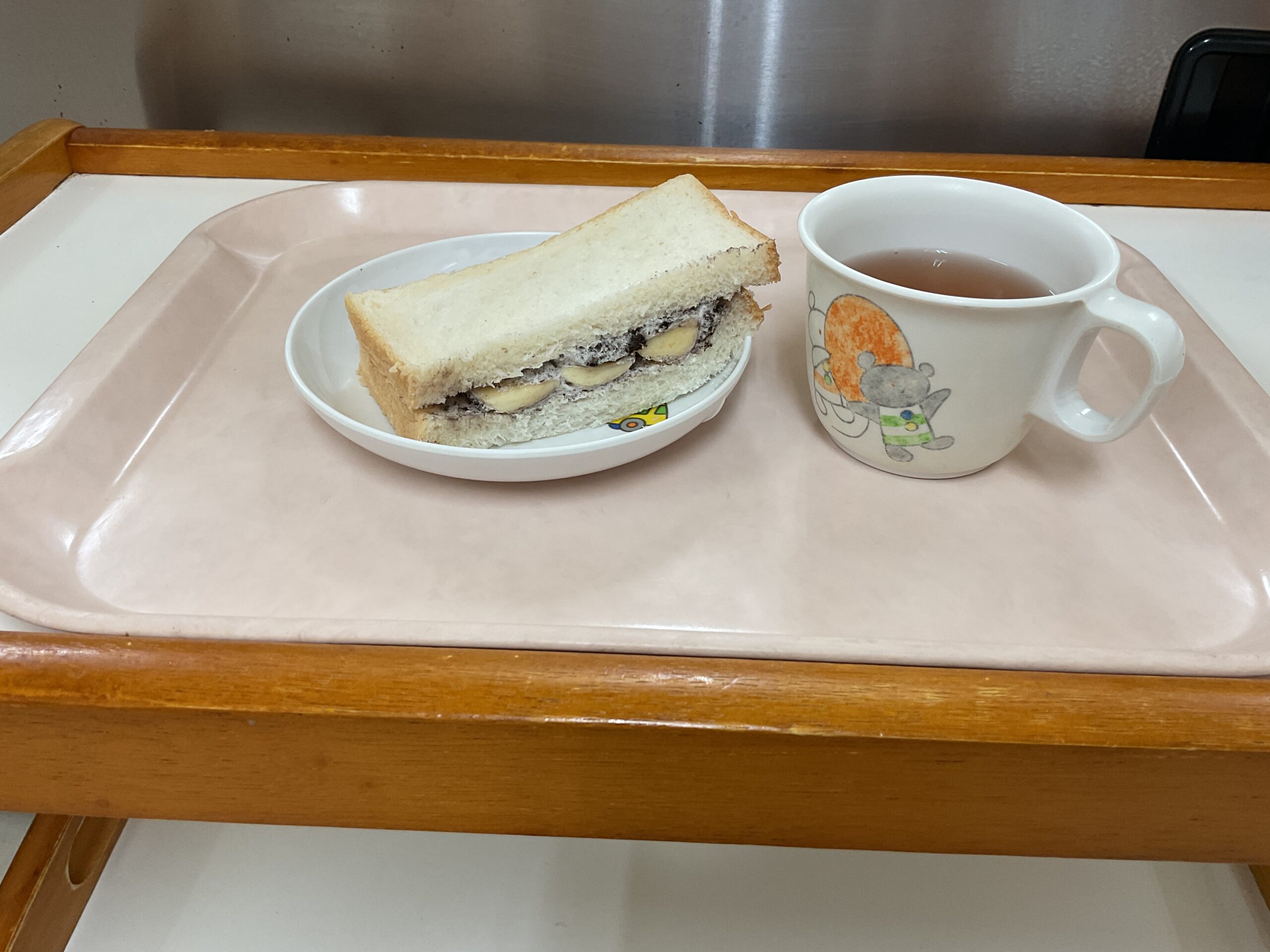〈午後のおやつ〉バナナオレクリームサンド、お茶(ほうじ茶)。