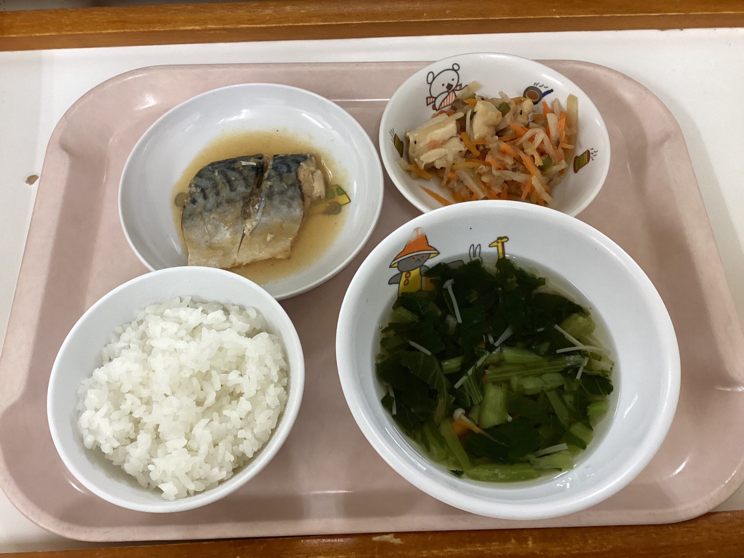 〈給食〉さばのみそ煮、ごはん、切り干し大根の煮物、小松菜のすまし汁。