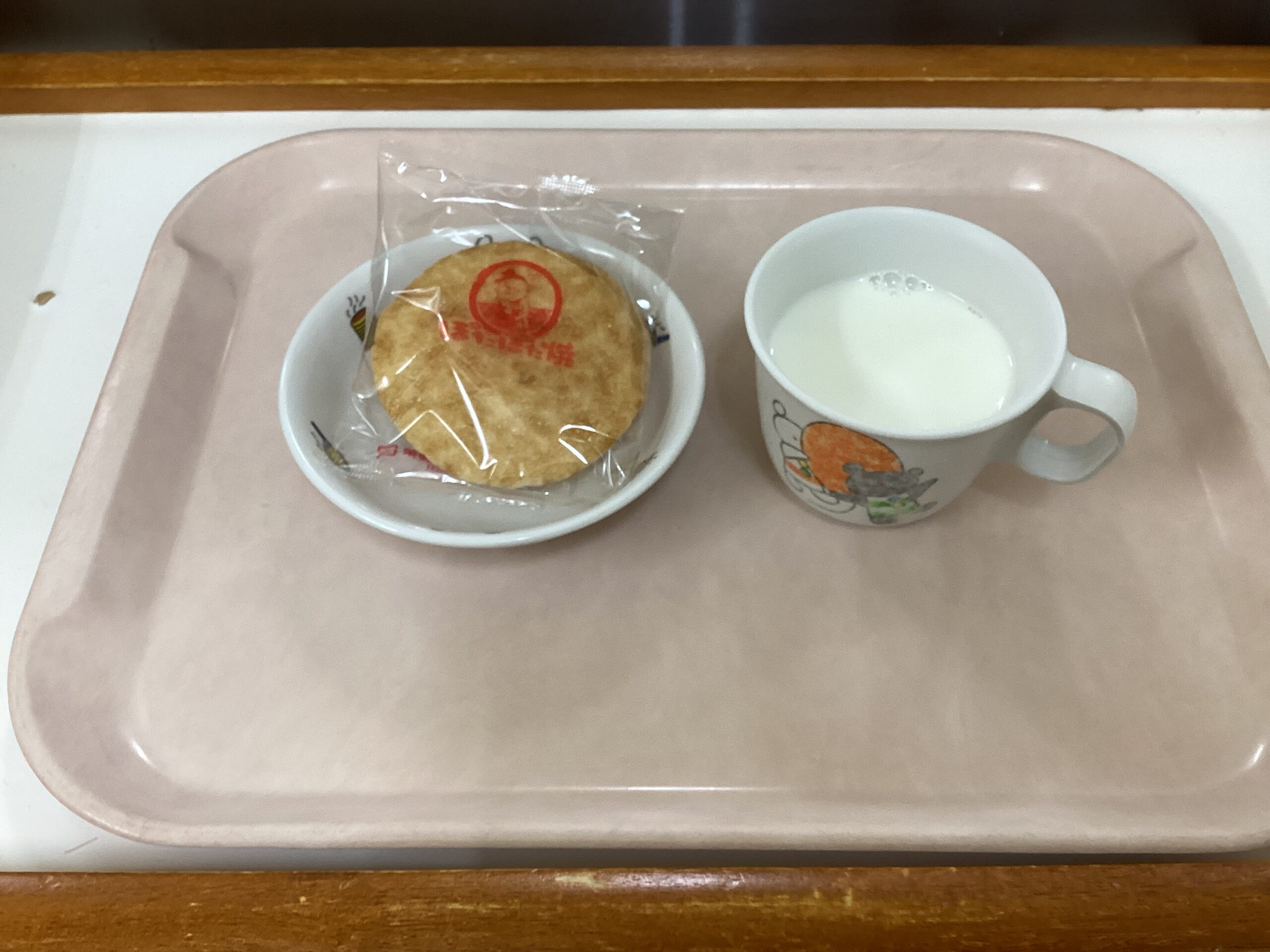 〈午後のおやつ〉せんべい(ぽたぽた焼き)、牛乳。