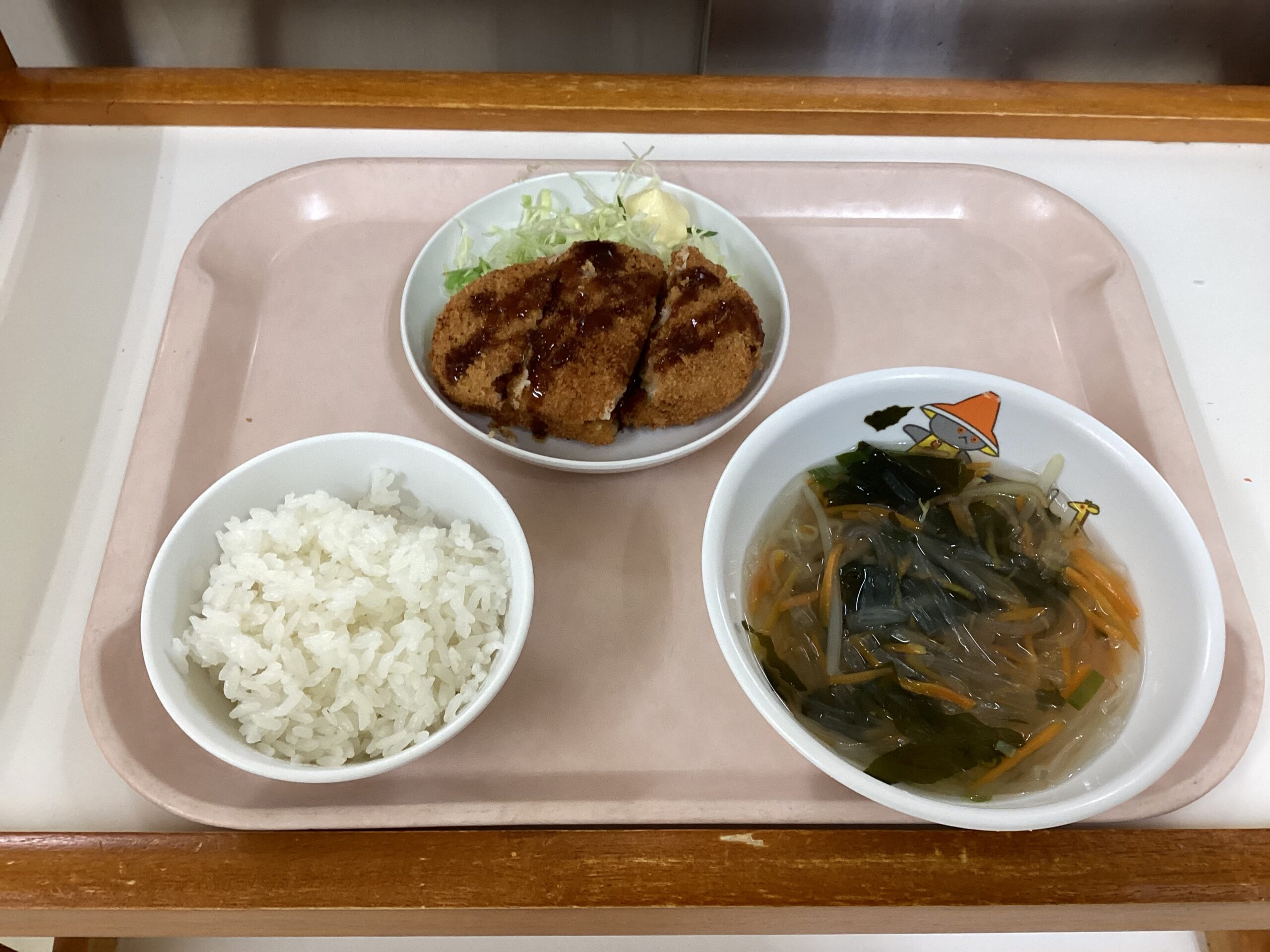 〈給食〉手作りコロッケ、ごはん、春雨スープ。