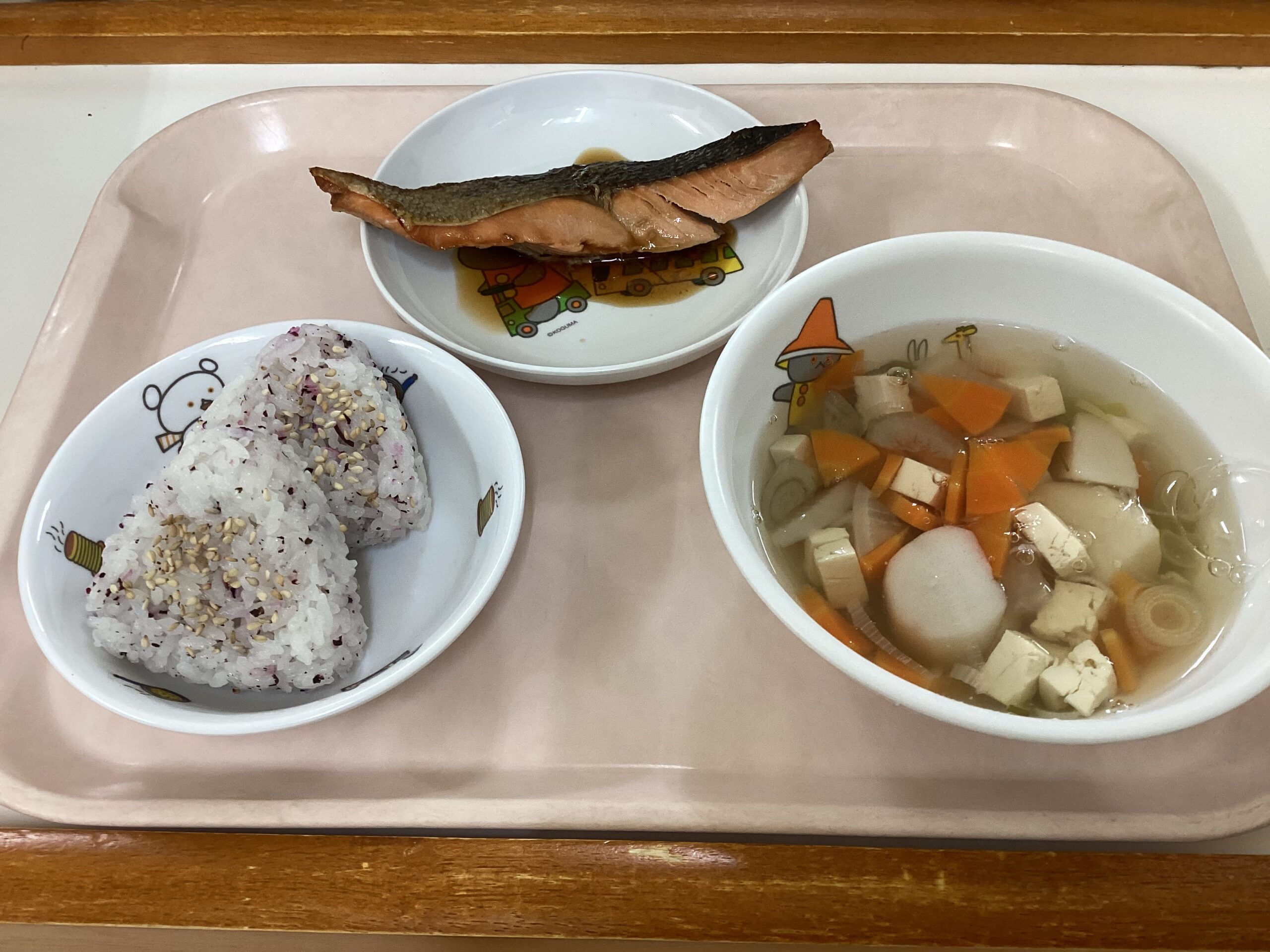 〈給食〉ゆかりおにぎり、鮭の照り焼き、けんちん汁。