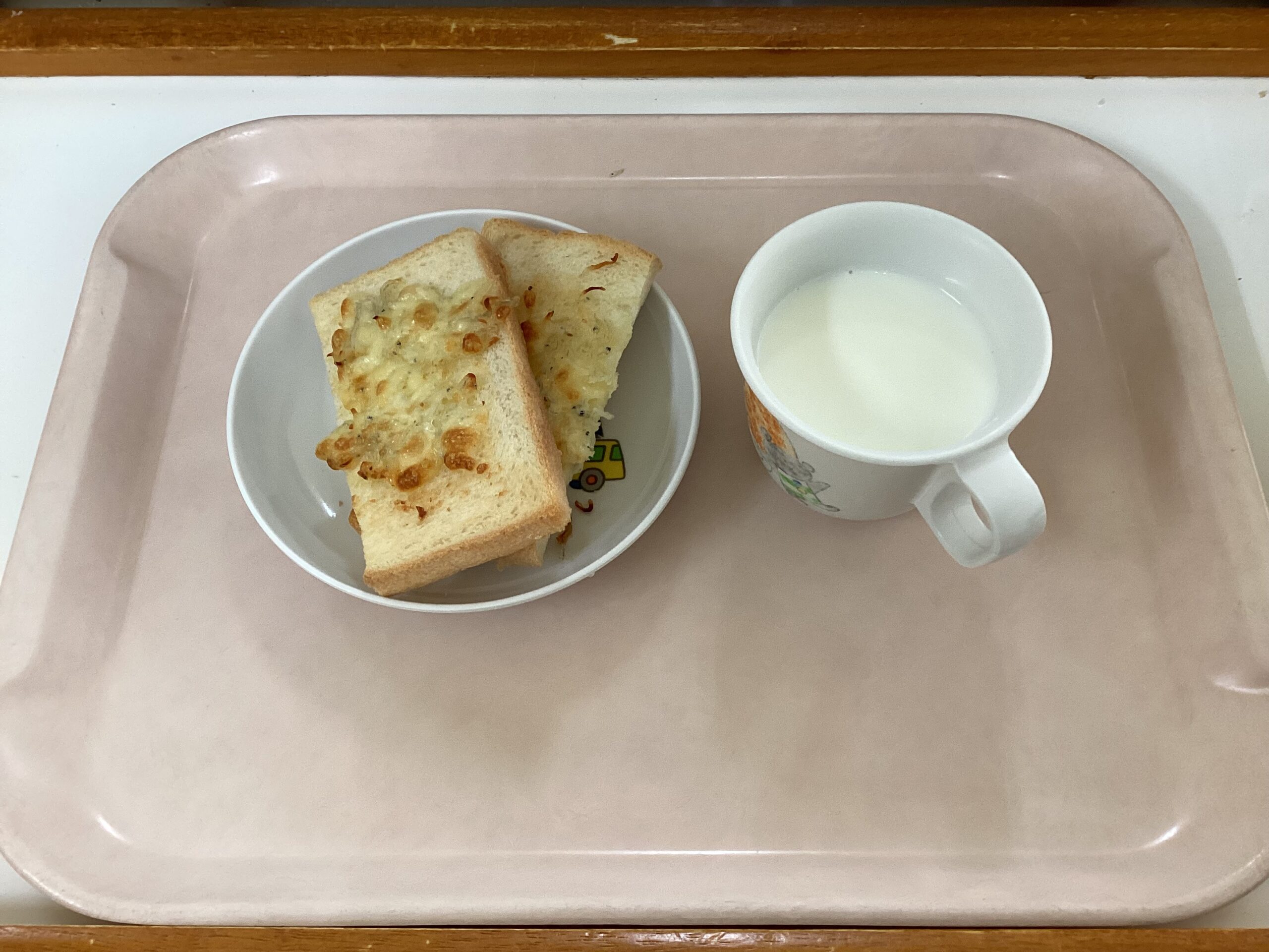 〈午後のおやつ〉しらすマヨトースト、ミルク。