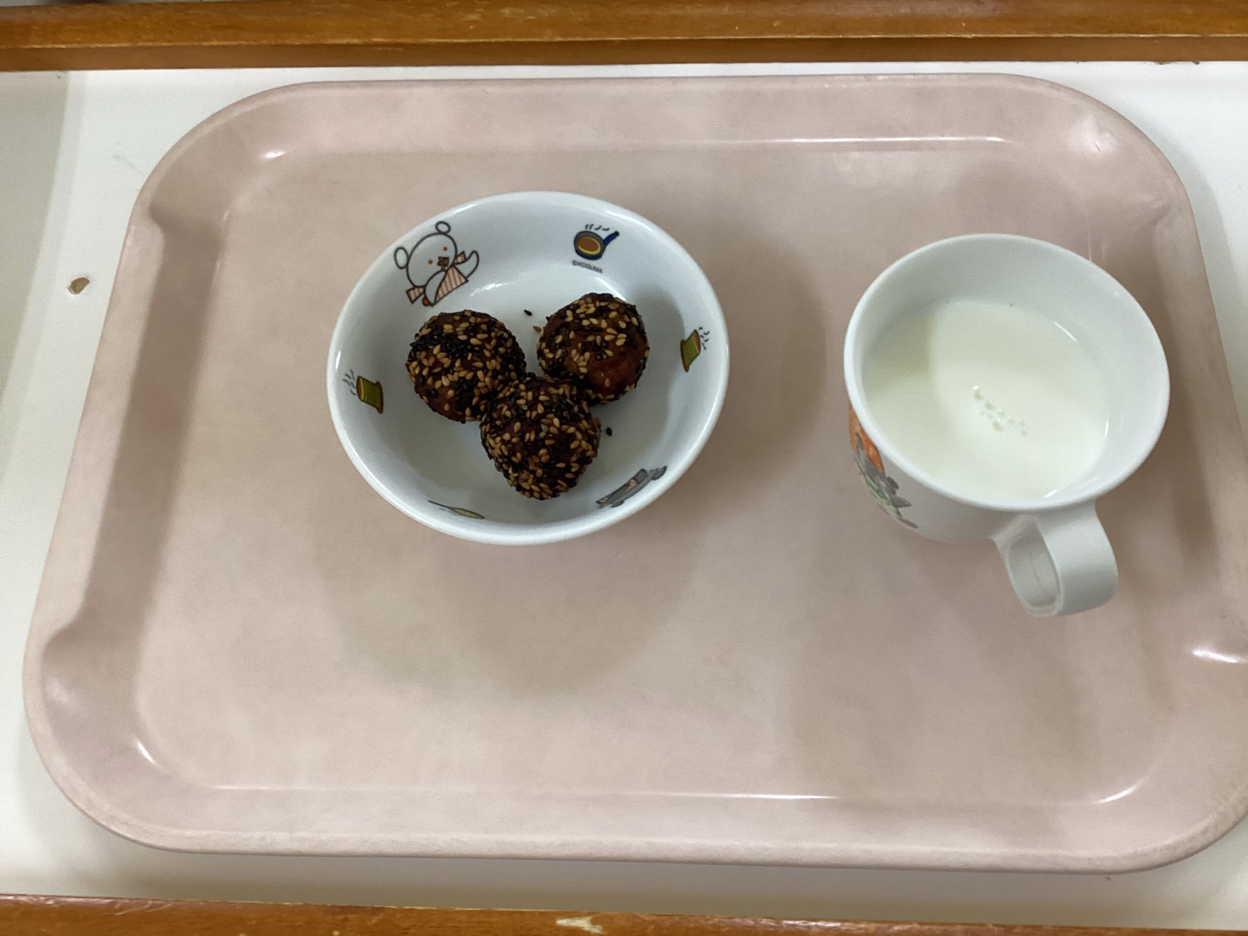 〈午後のおやつ〉さつまいものごまだんご、ミルク。