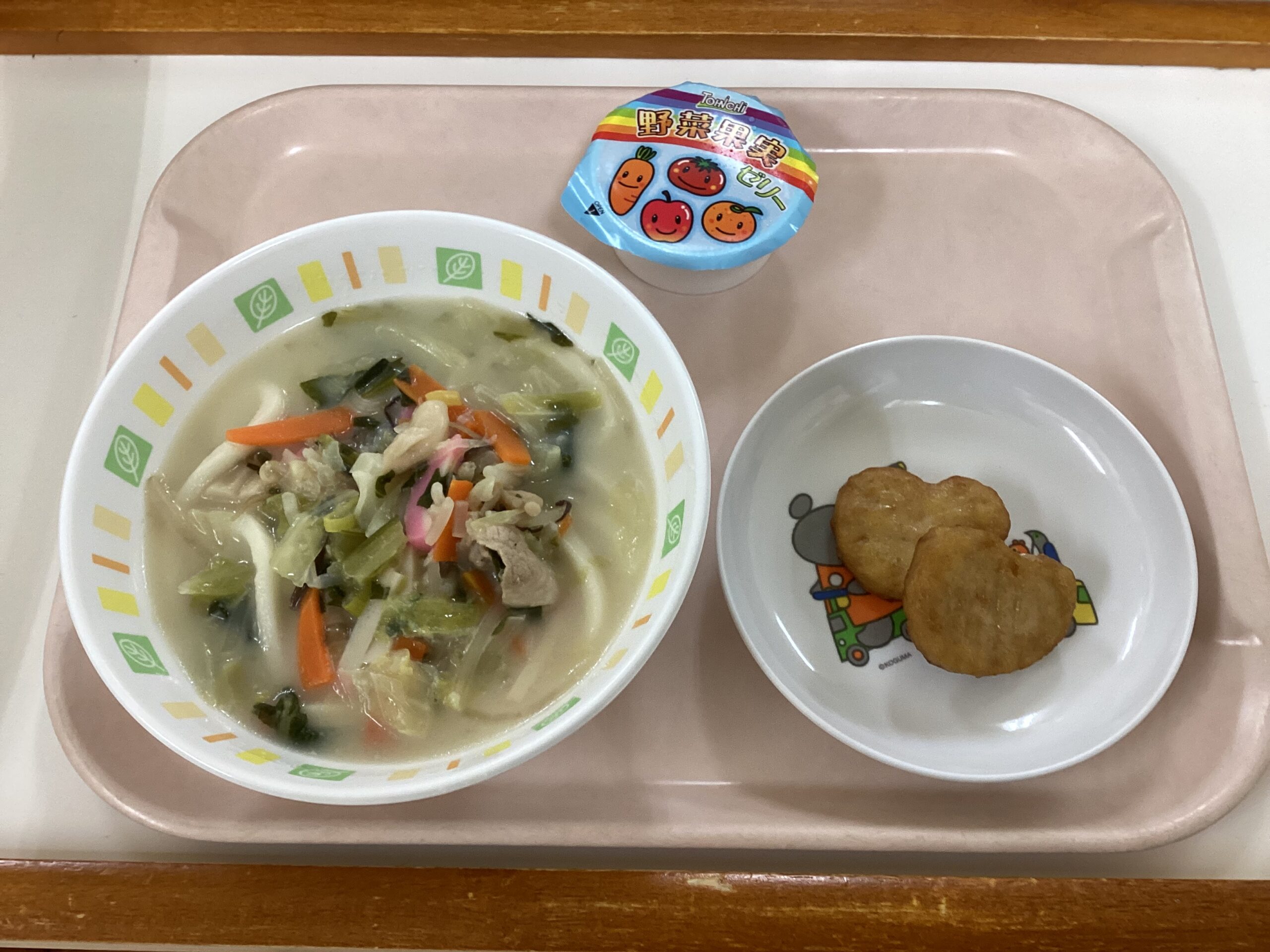〈給食〉ちゃんぽんうどん、チキンナゲット、野菜果物ゼリー。