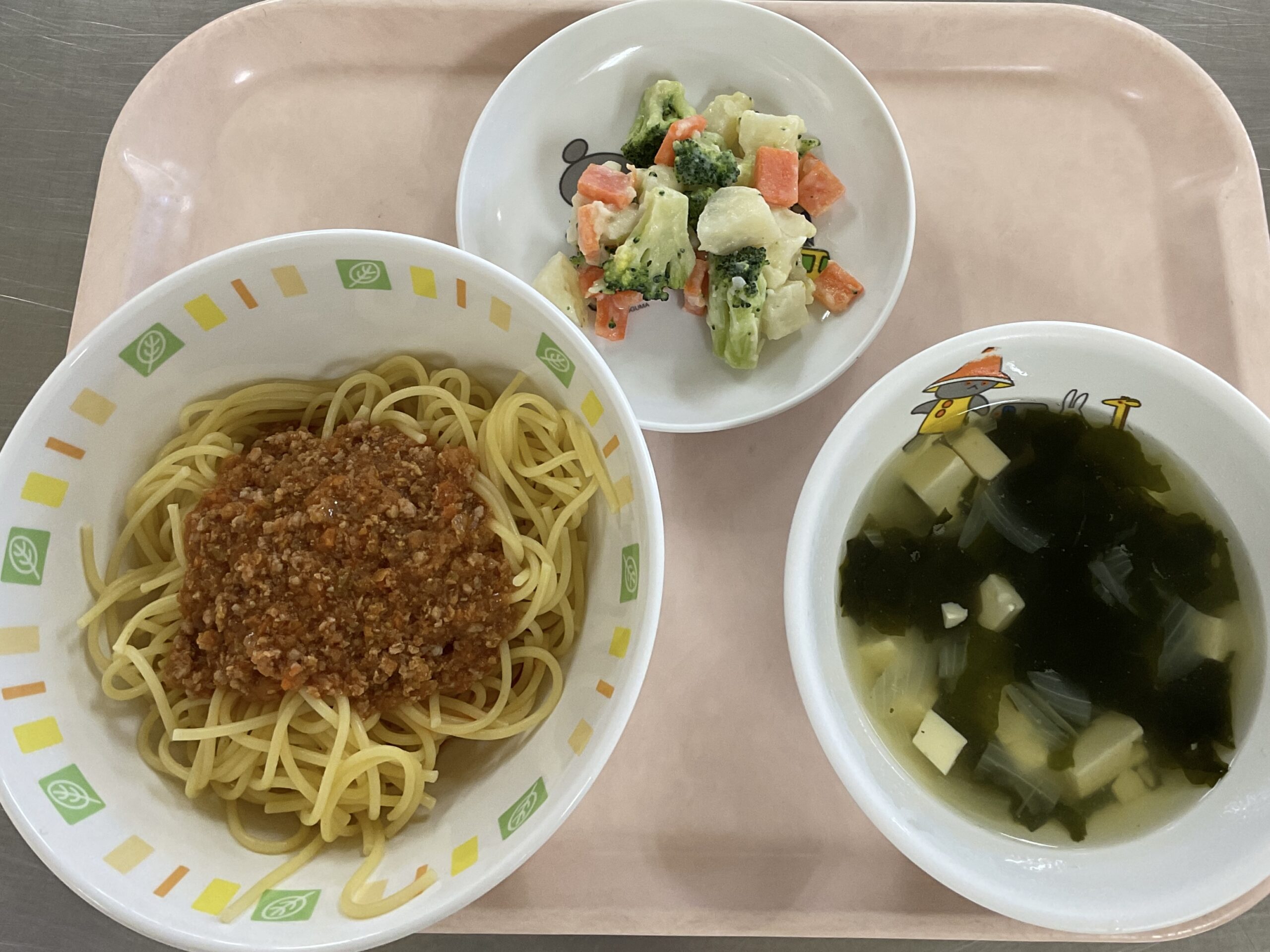 〈給食〉ミートスパゲッティ、ブロッコリーとじゃがいものサラダ、とうふスープ