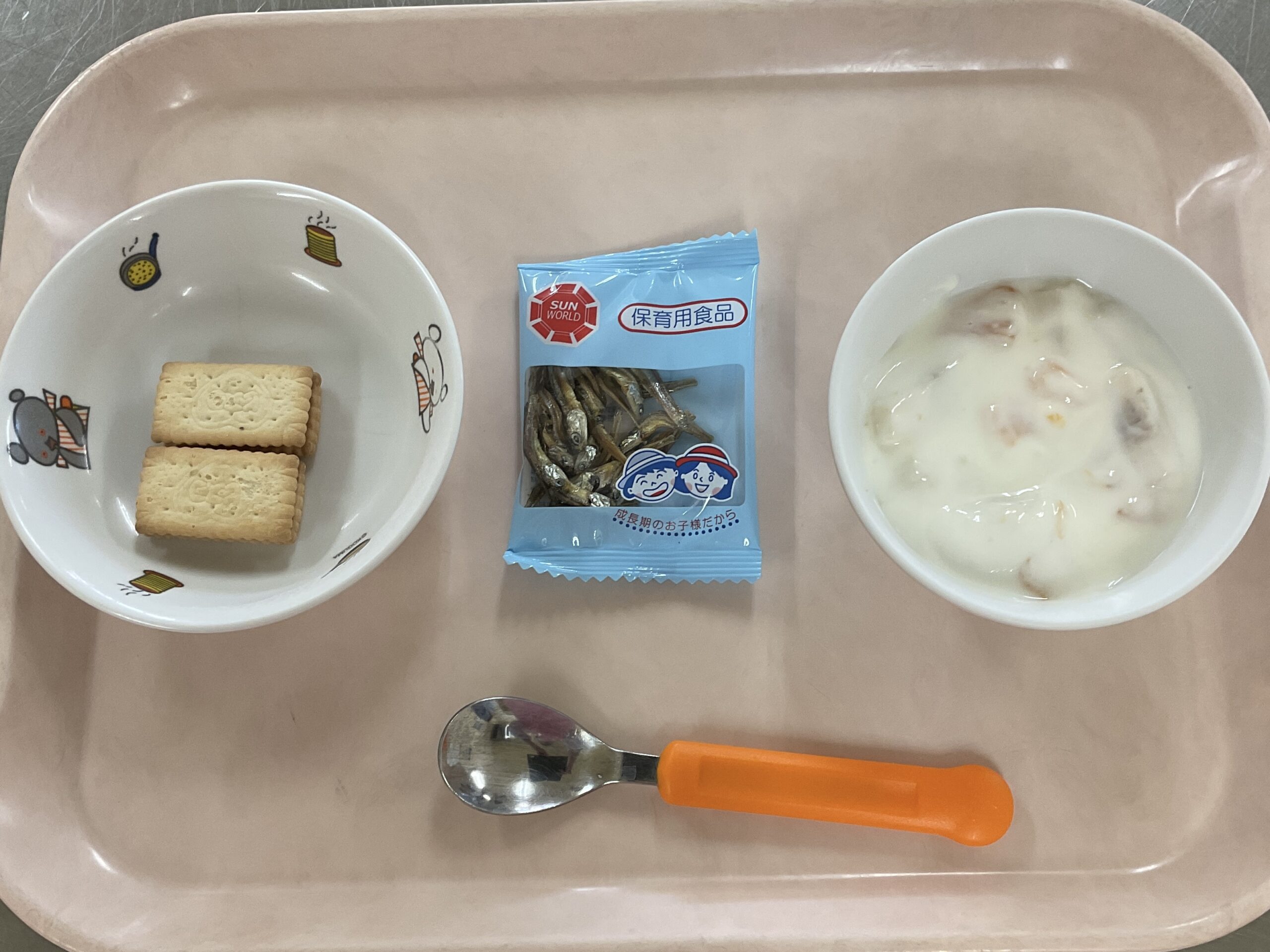 〈午後のおやつ〉フルーツヨーグルト、味付小魚(以上児)ビスコ(未満児)