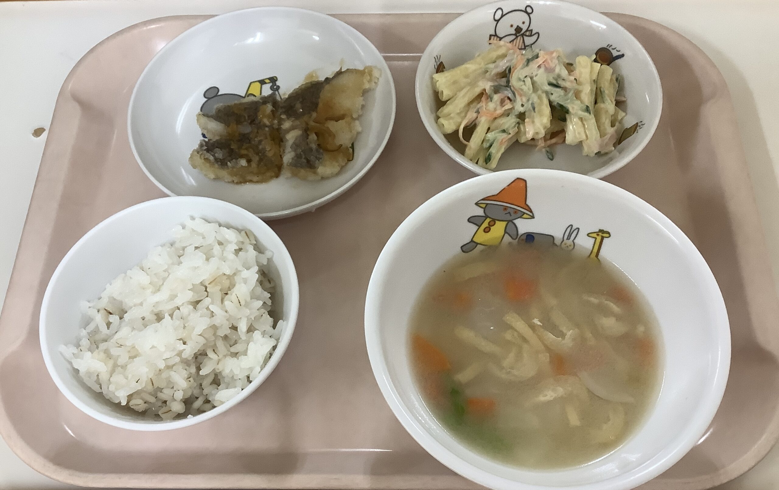 〈給食〉ホキのネギソースかけ、麦ごはん、マカロニサラダ、かぶのみそ汁