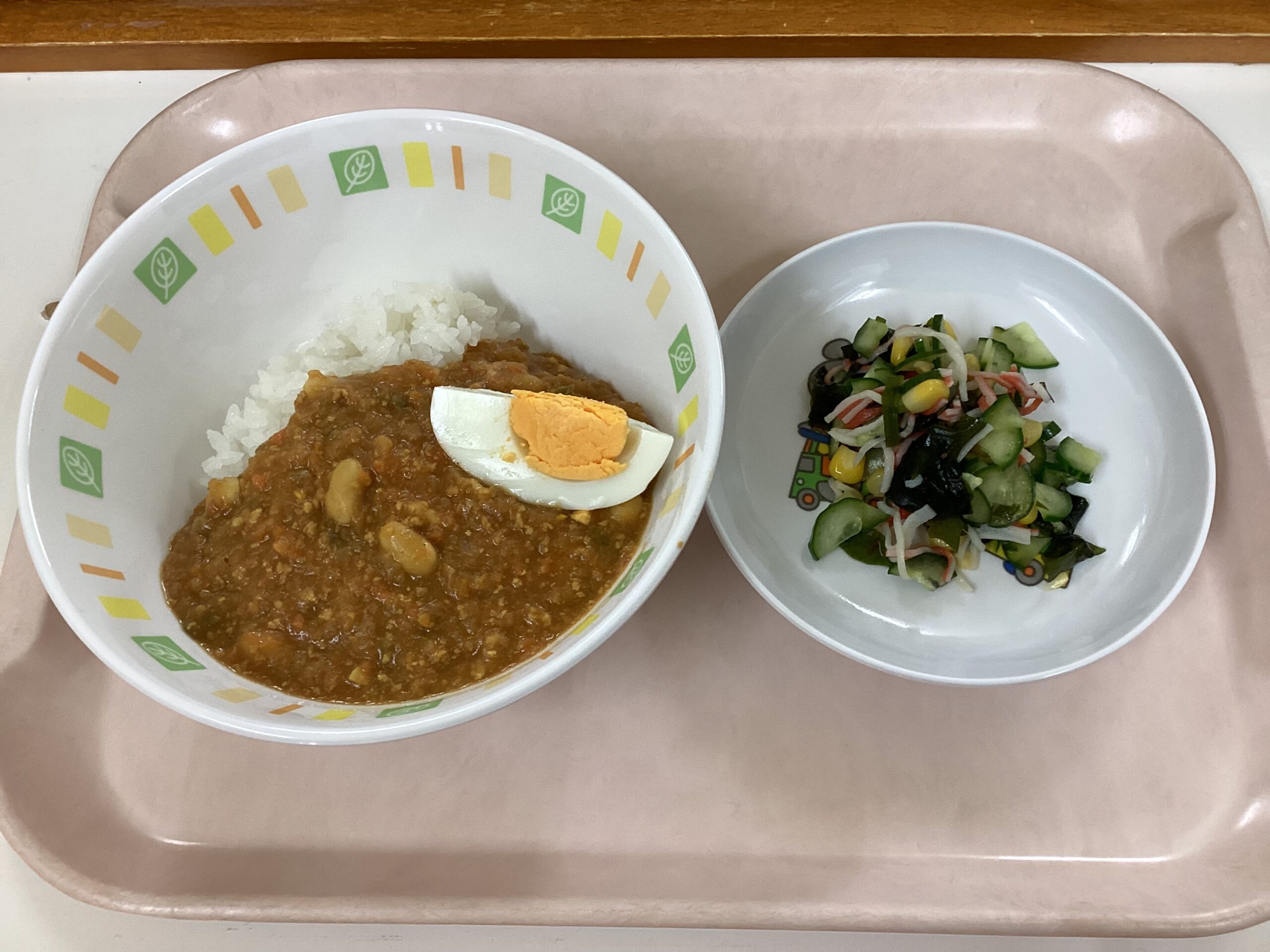 〈給食〉大豆入りキーマカレー、ゆで卵、きゅうりの酢の物。