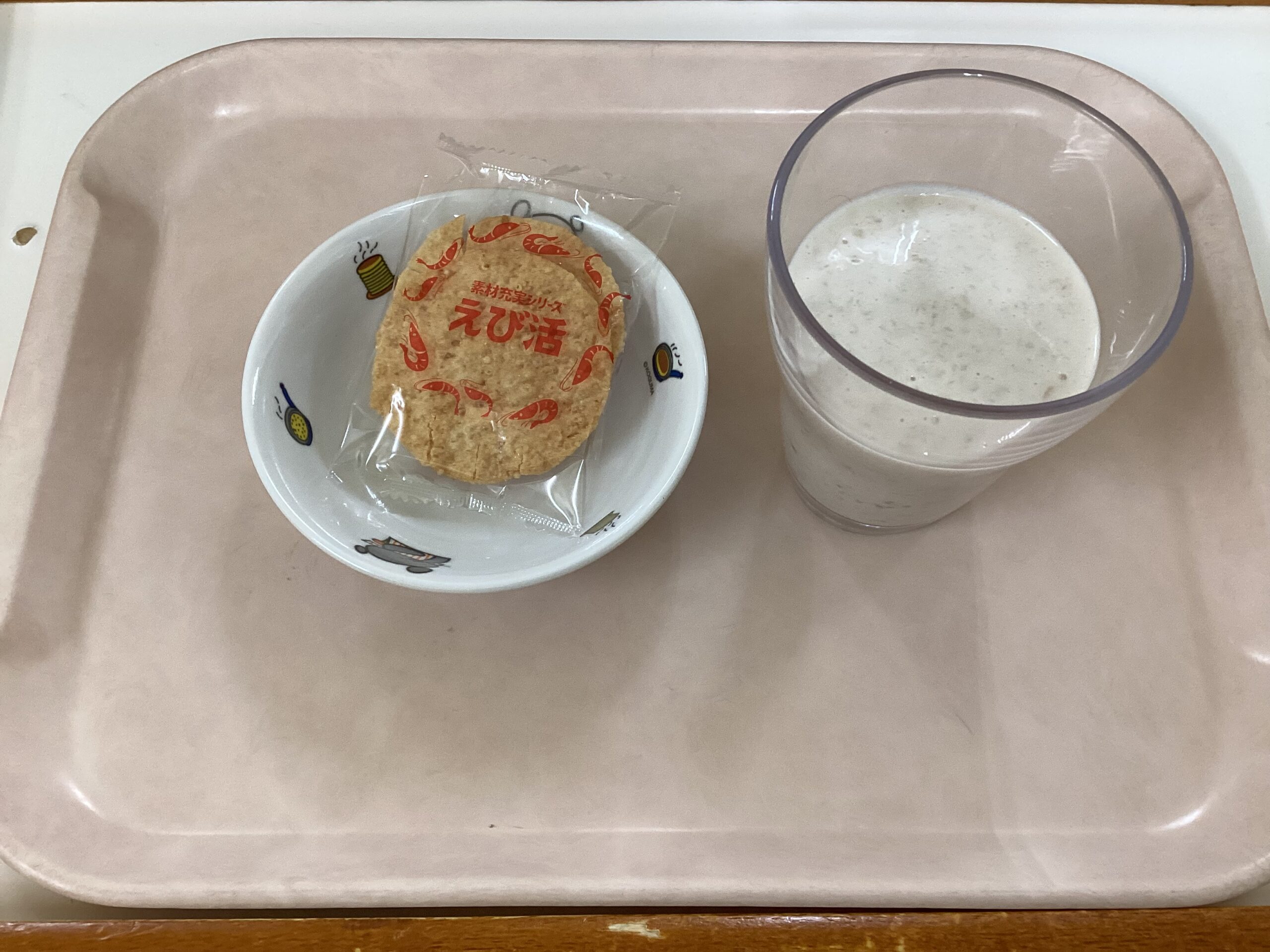 〈午後のおやつ〉バナナラッシー、せんべい(えび活)。
