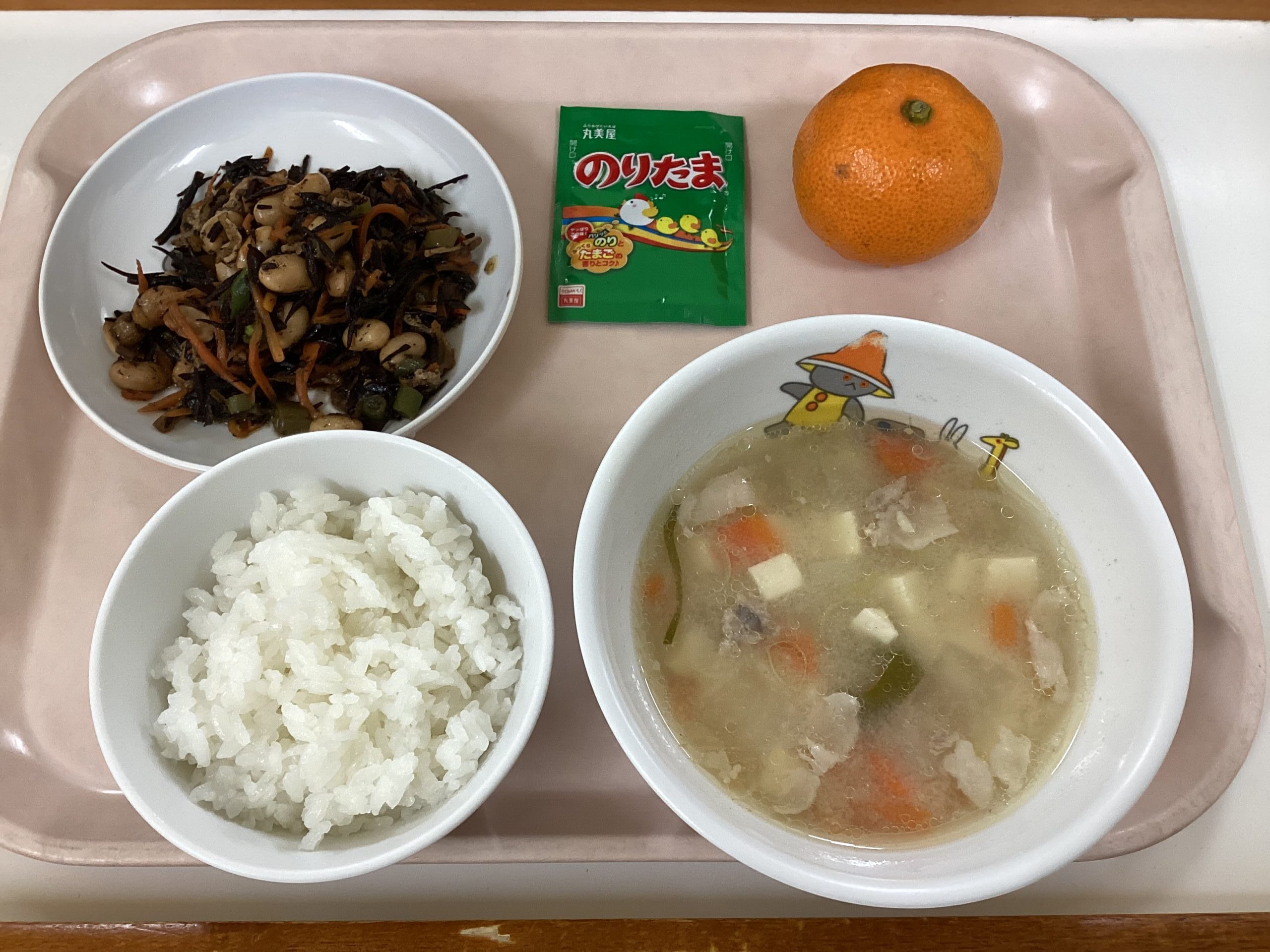 〈給食〉のりたまごはん、ひじき煮、じゃがいも入り豚汁、みかん。