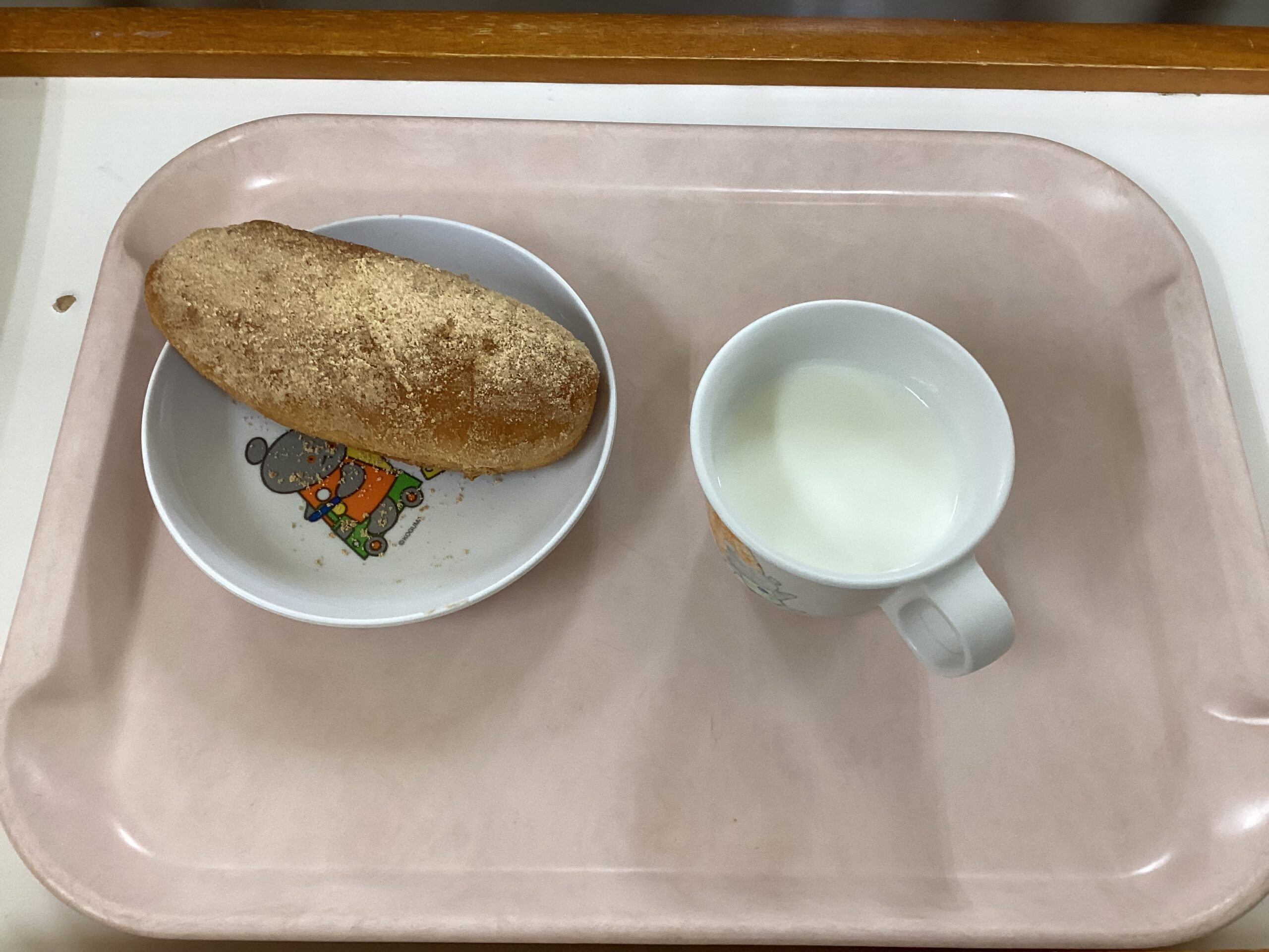 〈午後のおやつ〉きなこ揚げパン、ミルク。