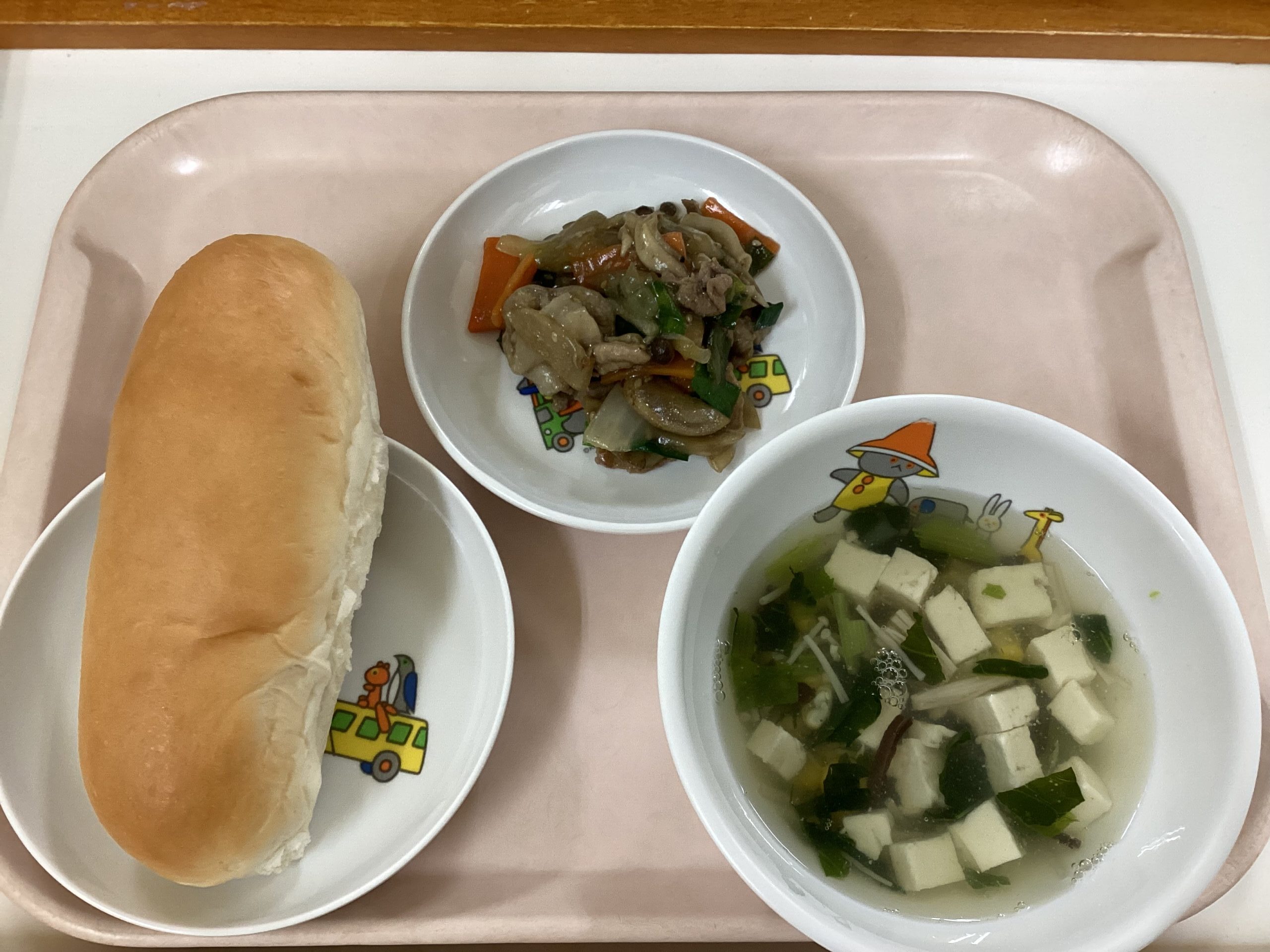 〈給食〉コッぺパン、肉野菜炒め、中華スープ。