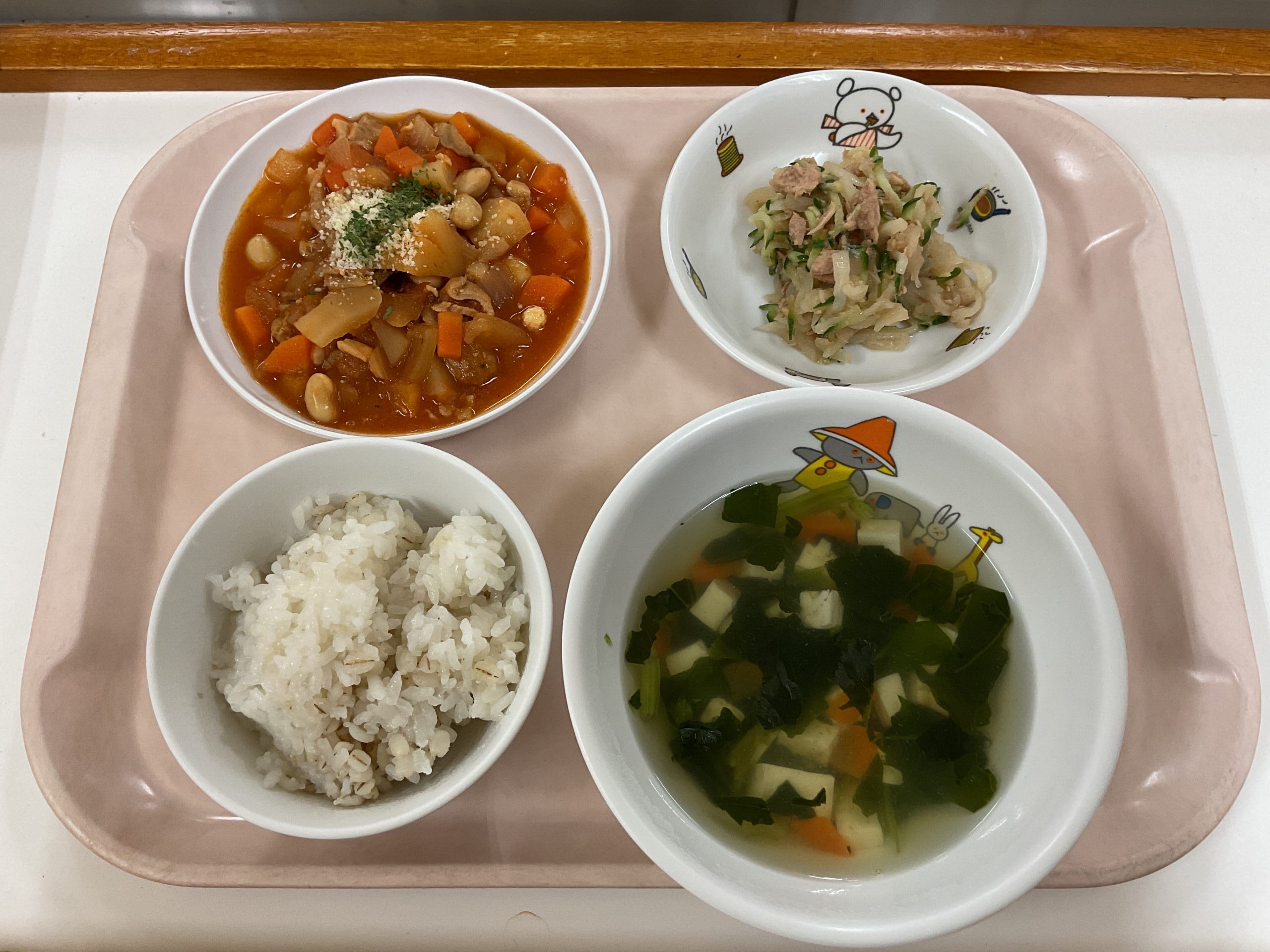 〈給食〉麦ご飯,ポークビーンズ,きゅうりの中華風和えもの,豆腐とほうれん草のスープ。