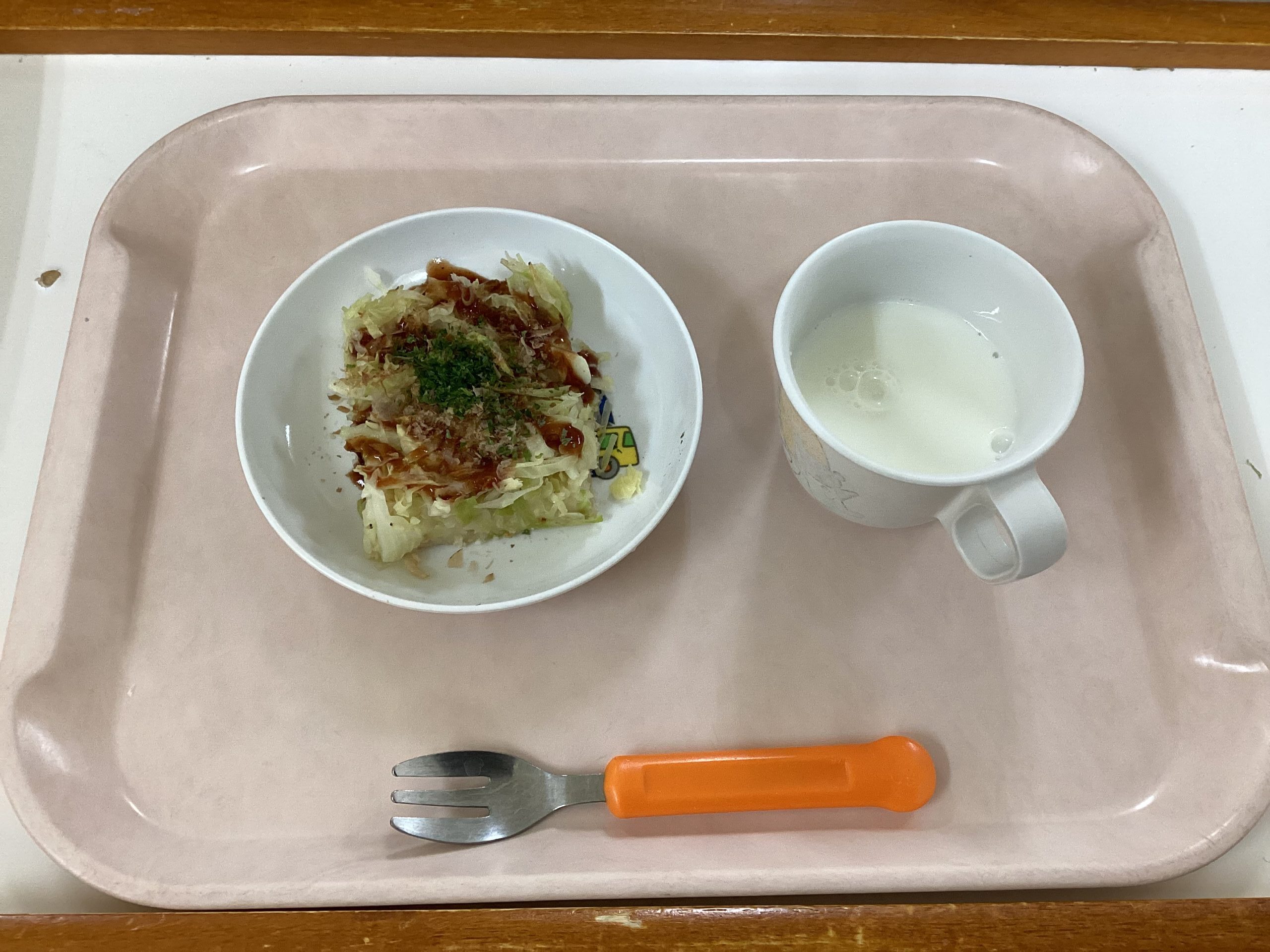 〈午後のおやつ〉ポテトのキャベツ焼き、牛乳。