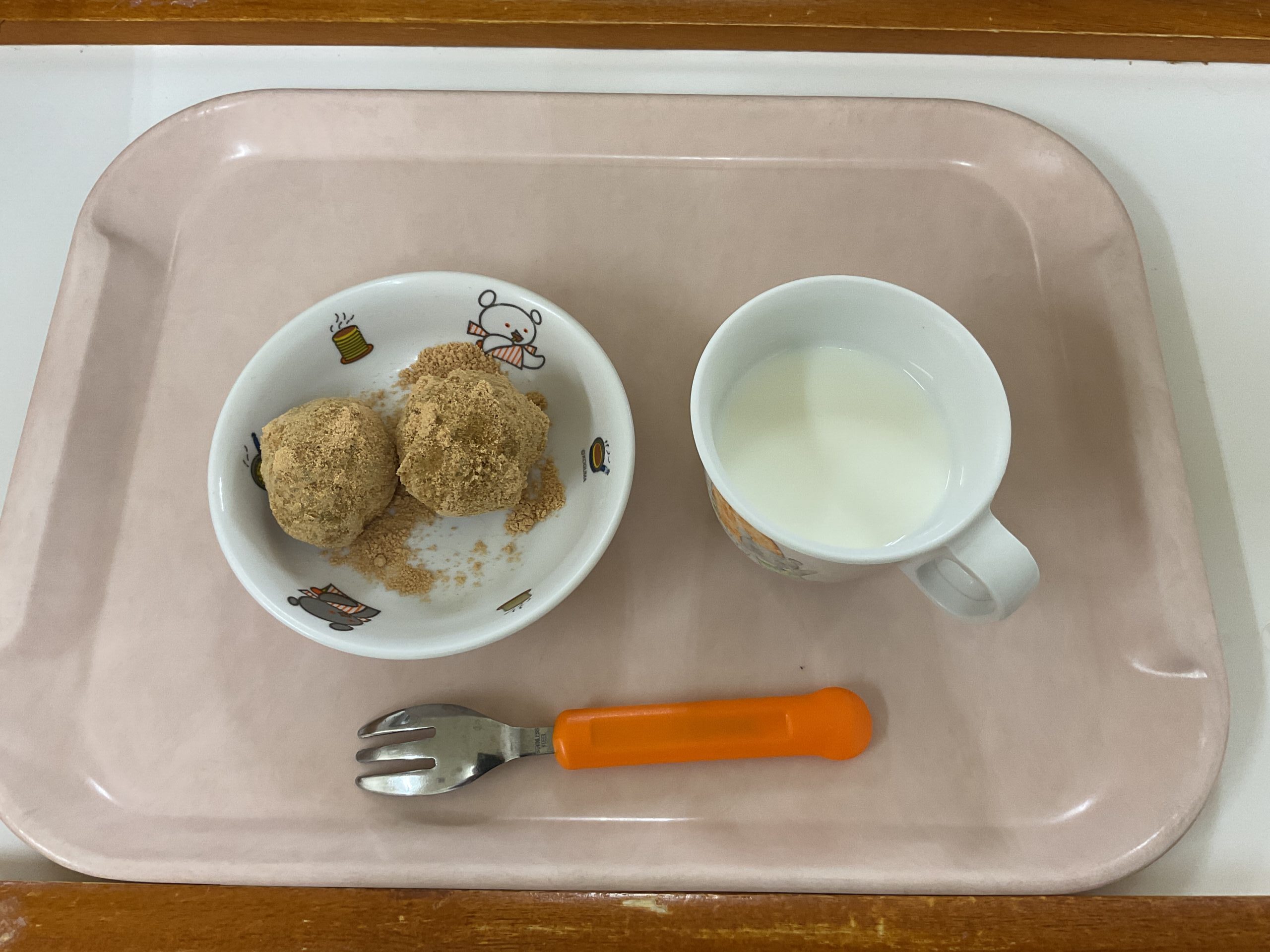 〈午後のおやつ〉さつまいも団子、牛乳。