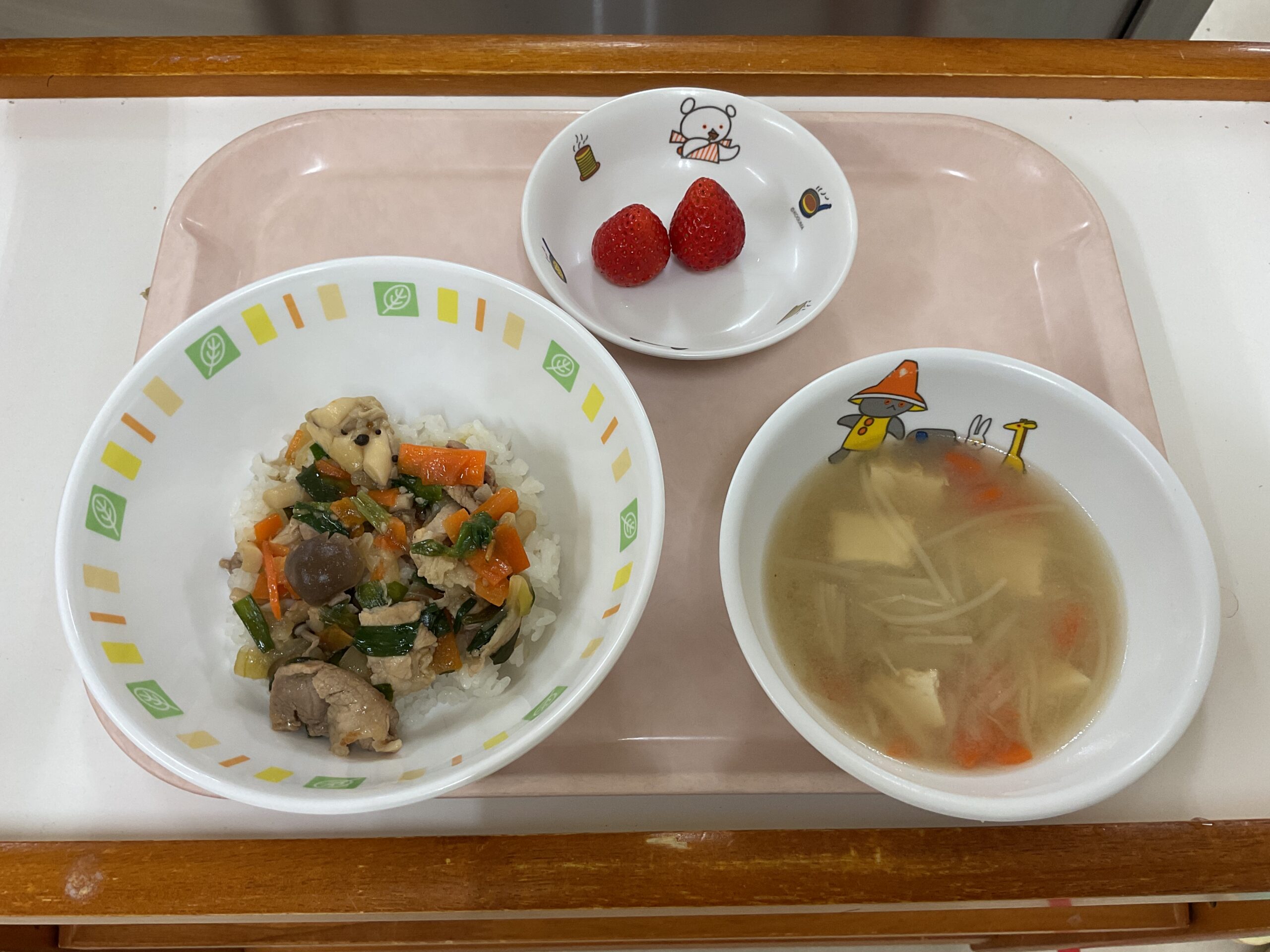 〈給食〉肉野菜炒め丼、大豆のみそ汁、いちご。