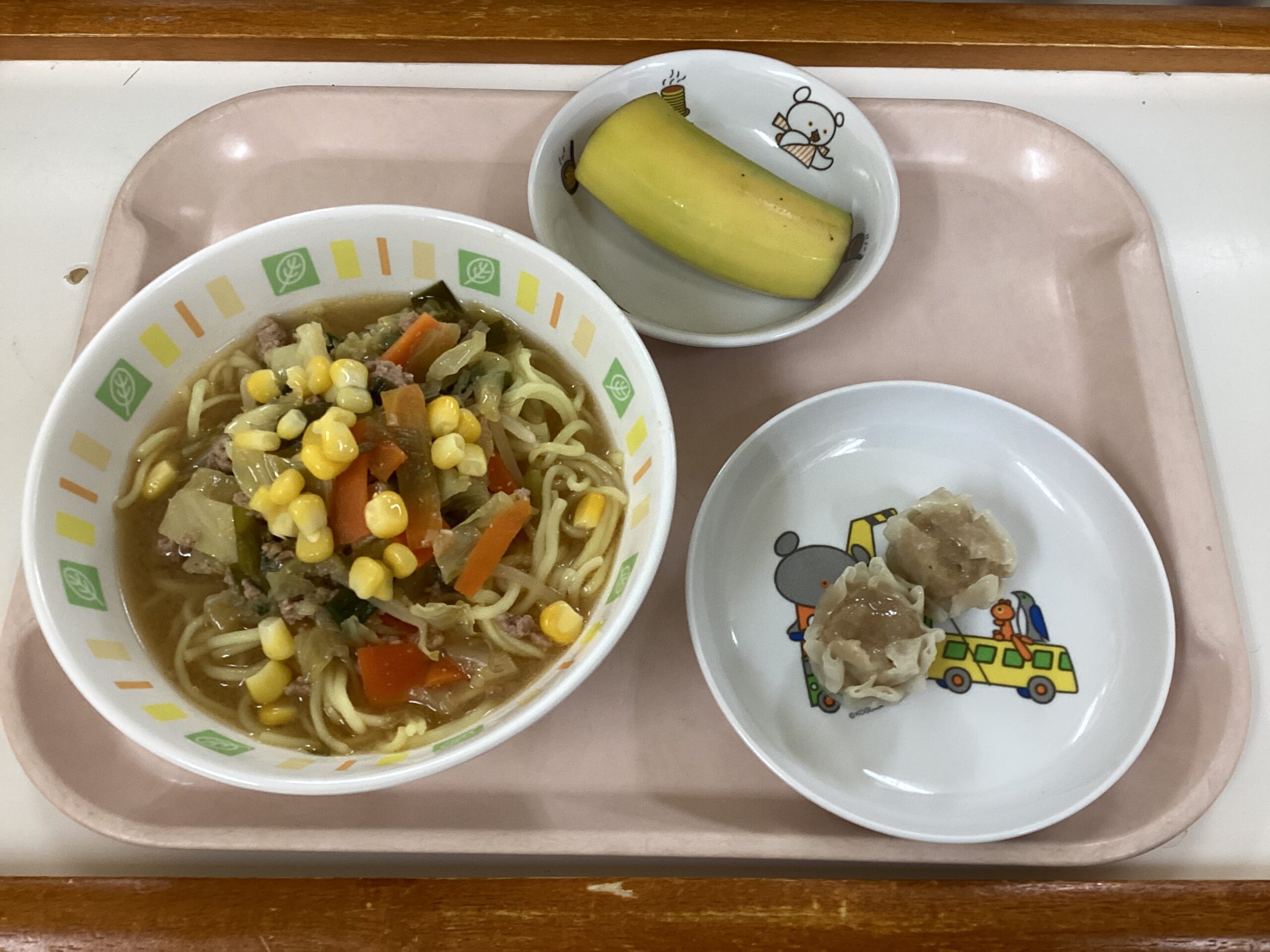 〈給食〉みそラーメン、肉しゅうまい、バナナ。
