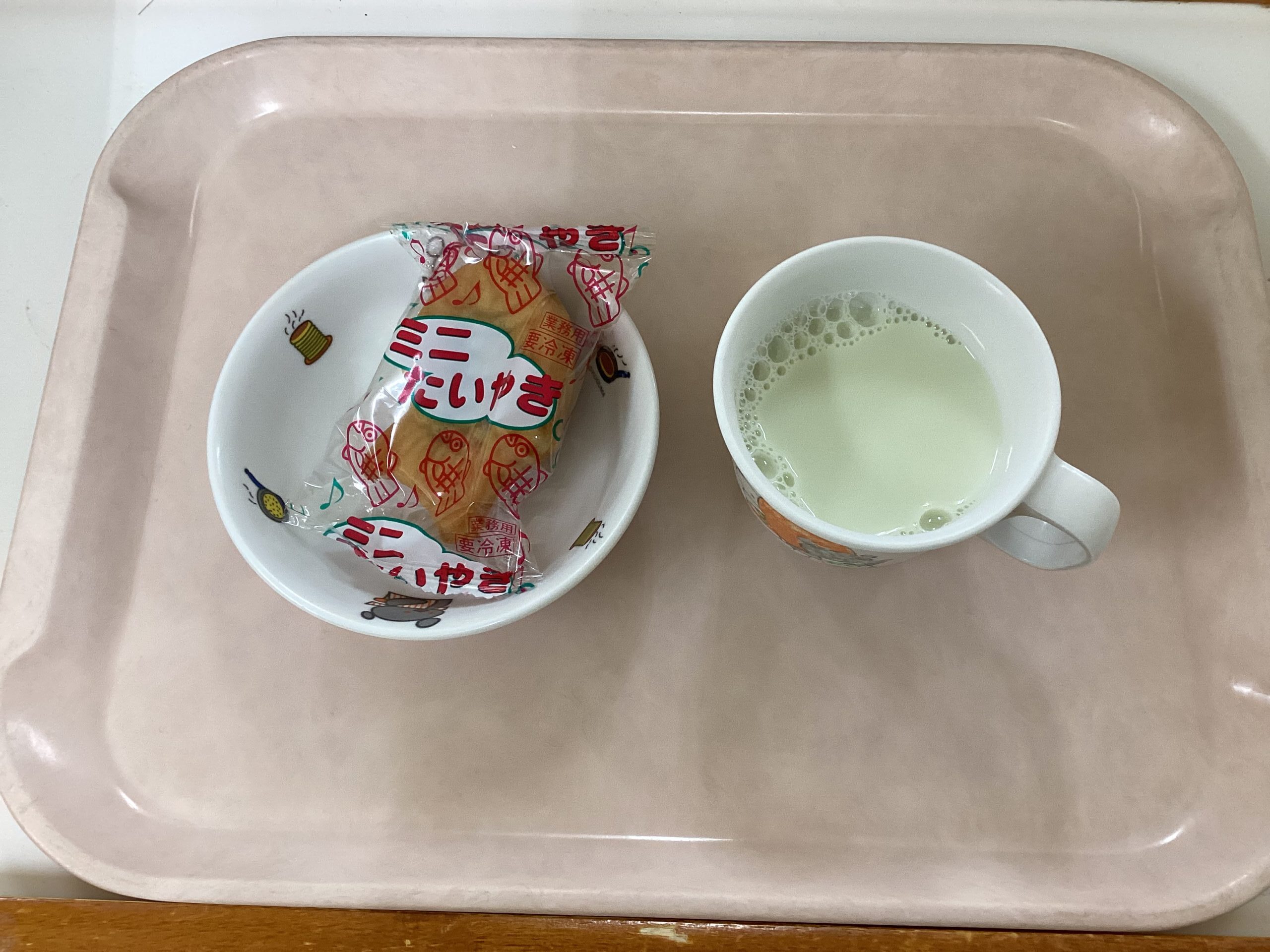 〈午後のおやつ〉ミニたい焼き、抹茶ミルク。