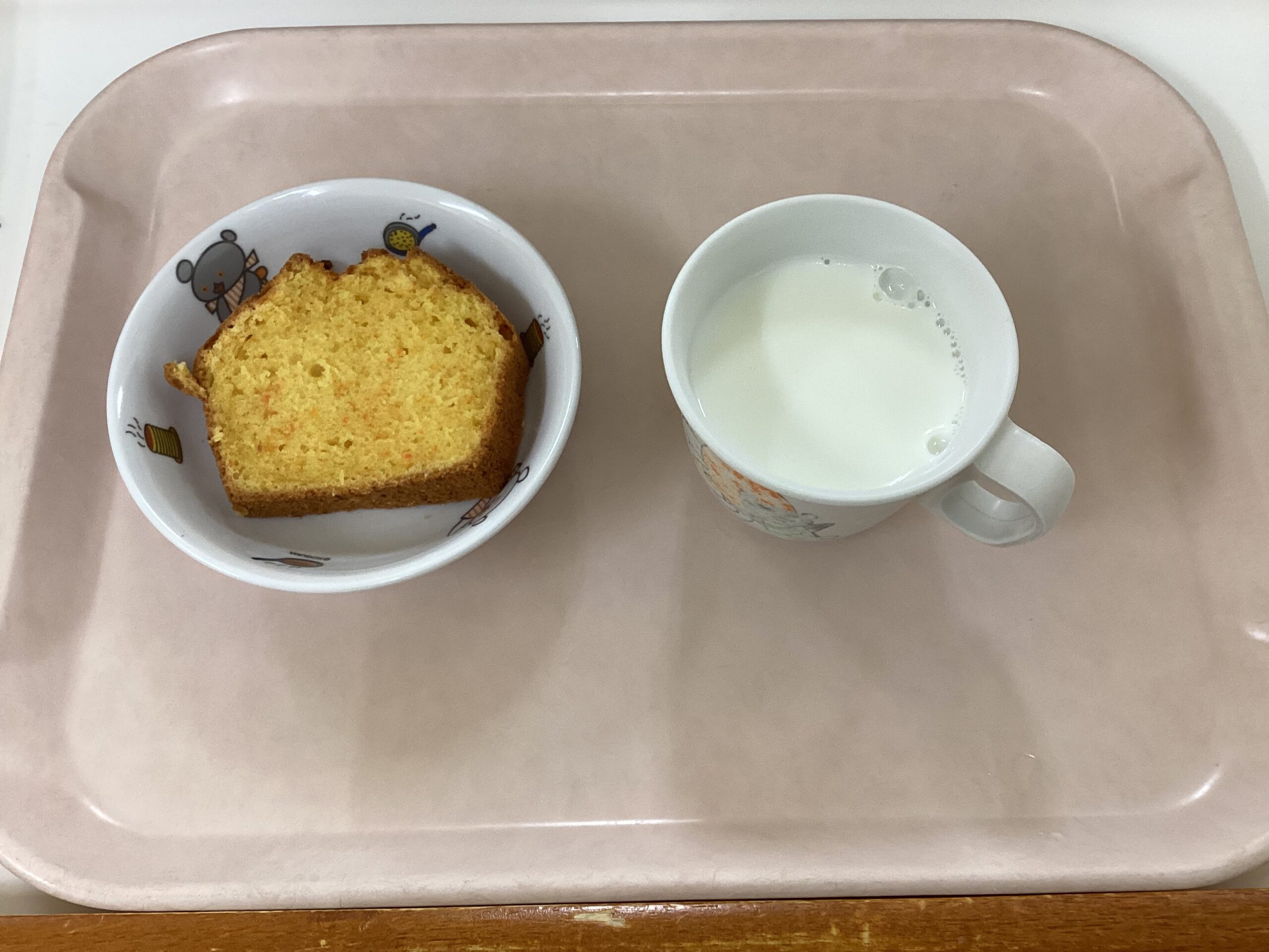 〈午後のおやつ〉にんじんケーキ、牛乳。