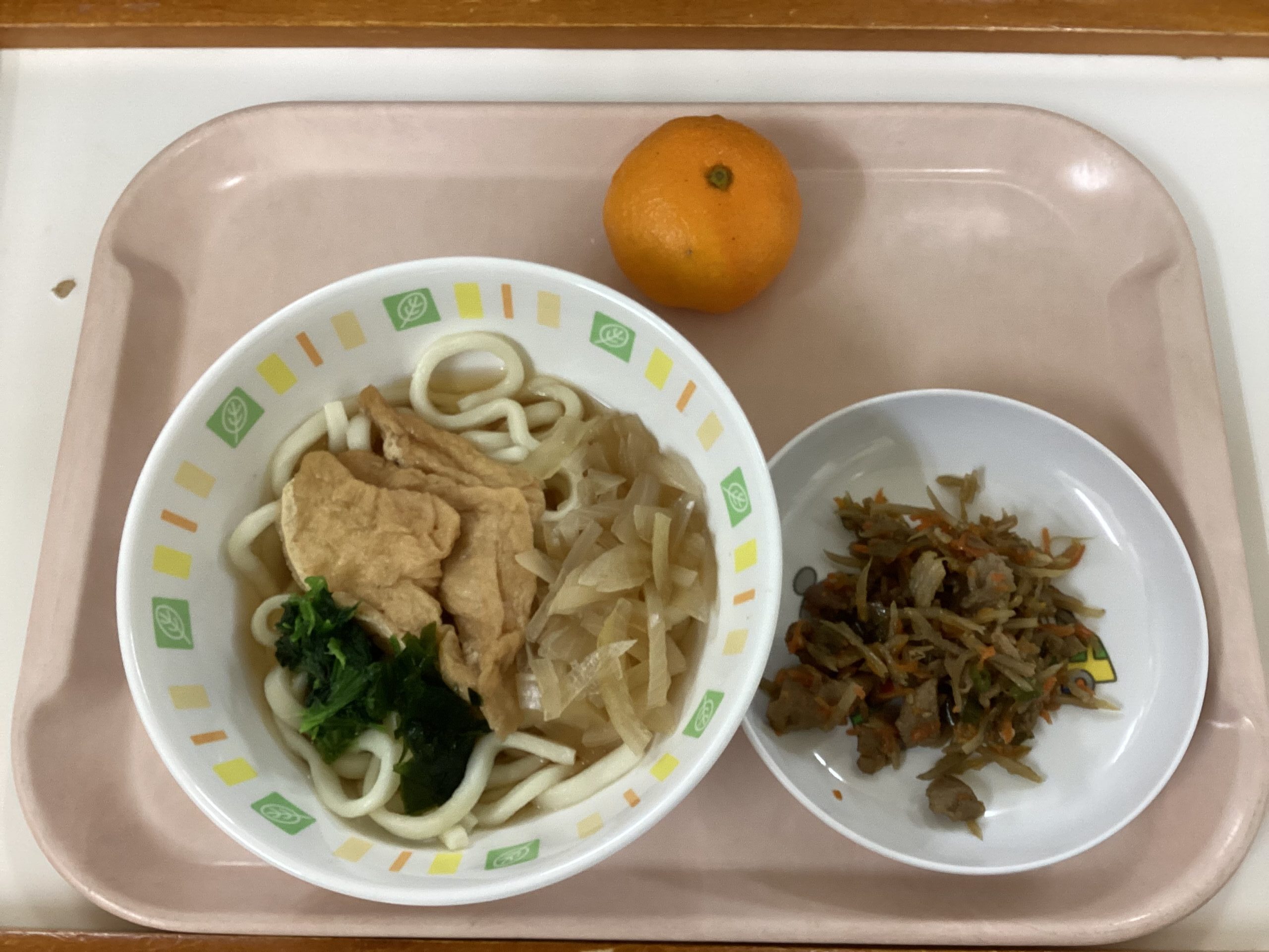 〈給食〉きつねうどん、きんぴらごぼう、みかん。