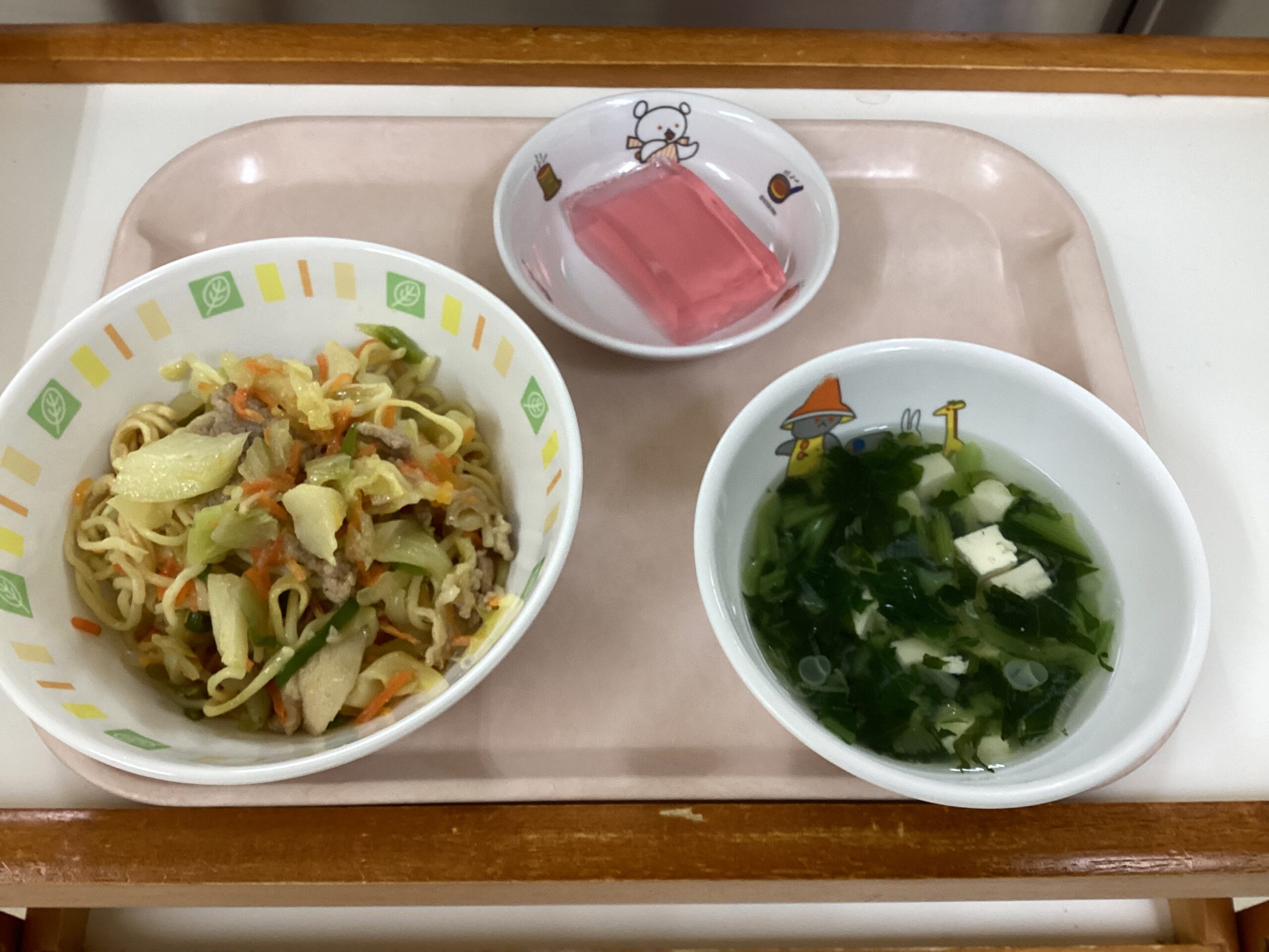 〈給食〉塩焼きそば、とうふスープ、手作りいちごゼリー。