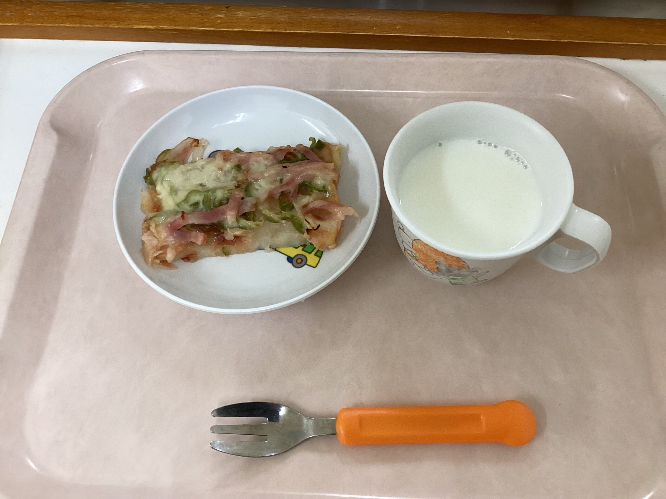 〈午後のおやつ〉じゃがピザ、牛乳。