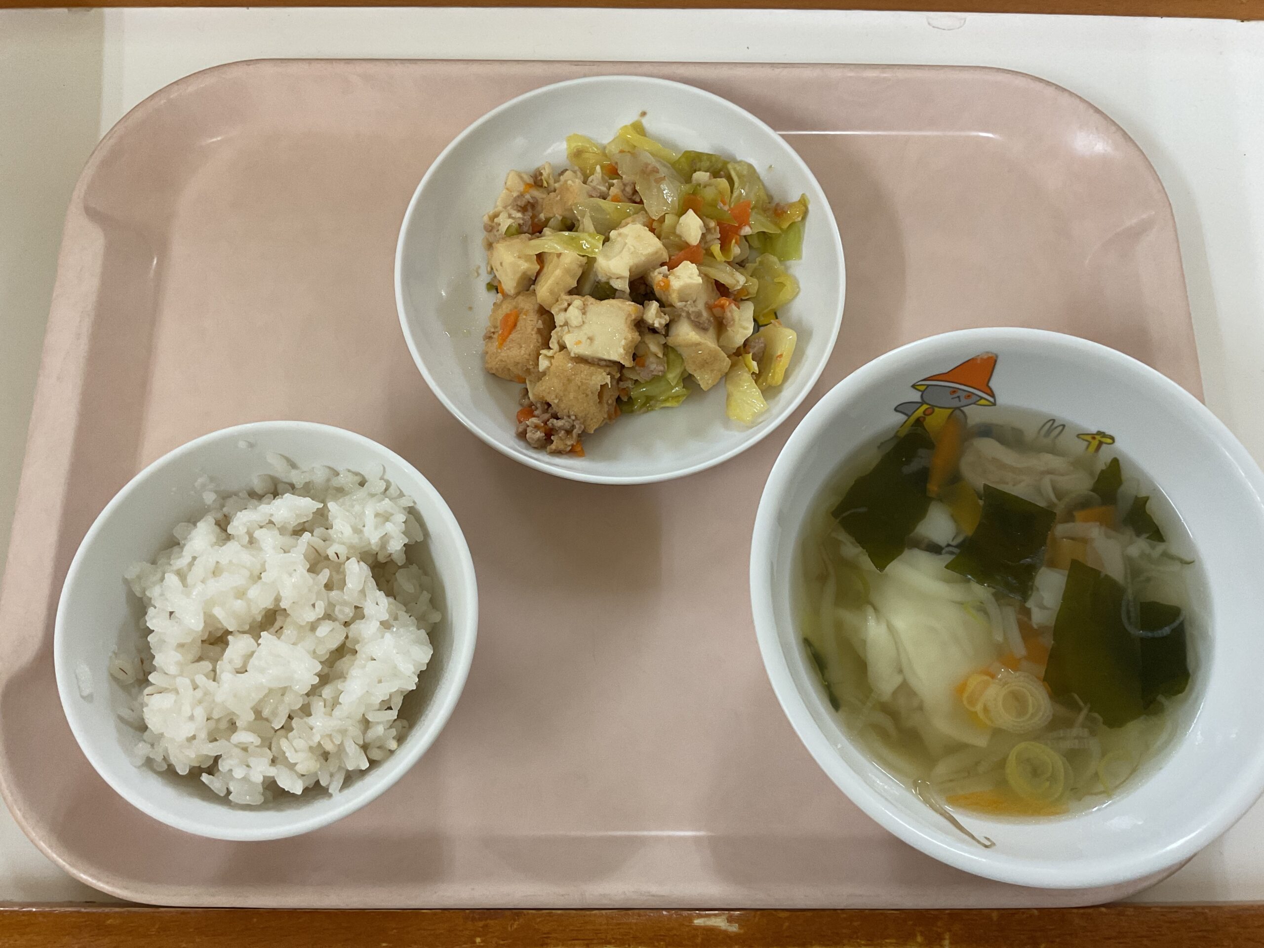 〈給食〉キャベツと厚揚げのみそ炒め、麦ご飯、ワンタンスープ。