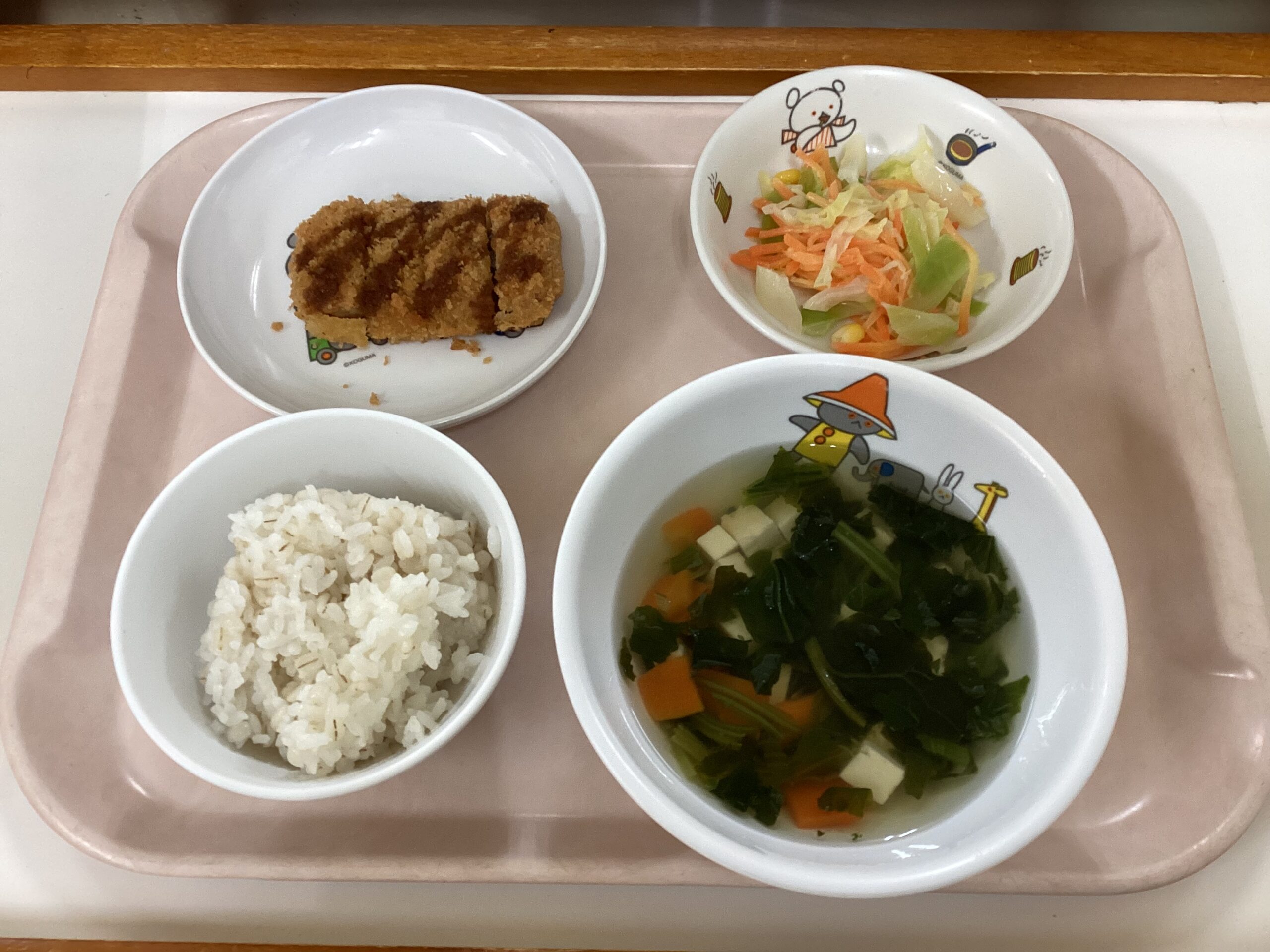 〈給食〉カツオカツ、麦ごはん、キャベツサラダ、ほうれん草のすまし汁。