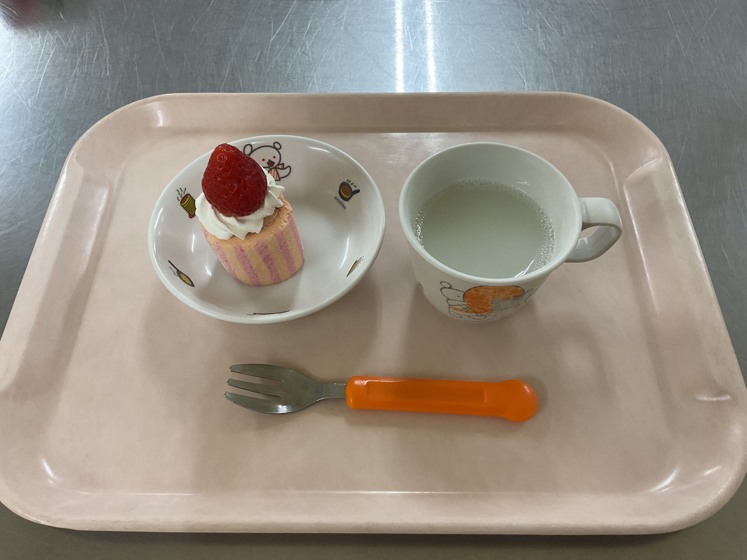 〈午後のおやつ〉いちごのロールケーキ、カルピス。