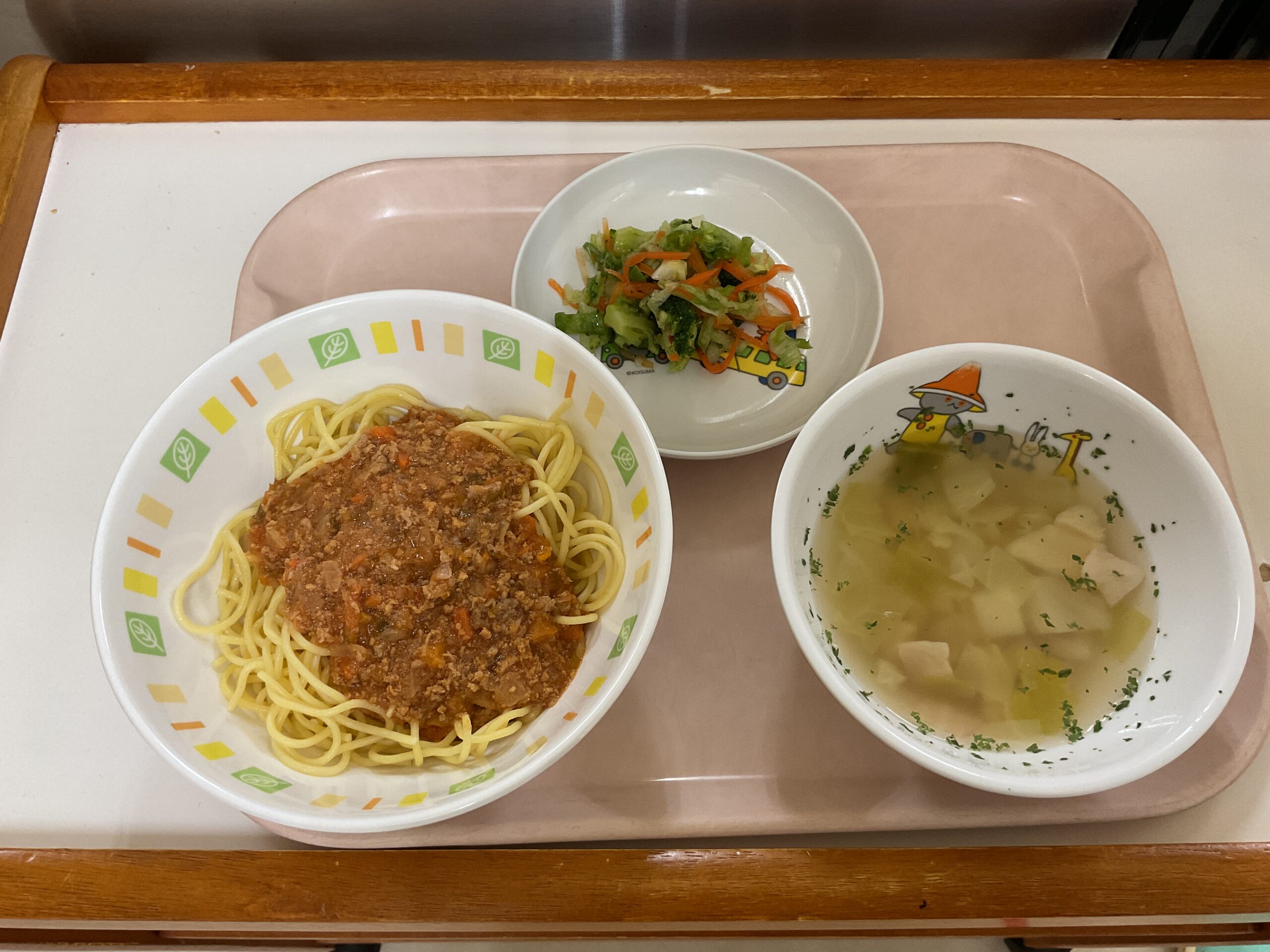 〈給食〉ミートスパゲッティ、ブロッコリーのサラダ、大豆入りコンソメスープ。