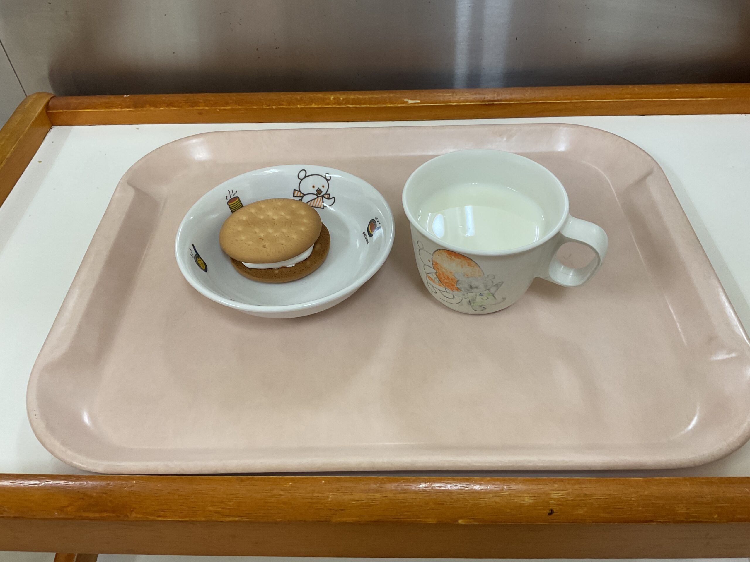 〈午後のおやつ〉マシュマロサンド、牛乳。