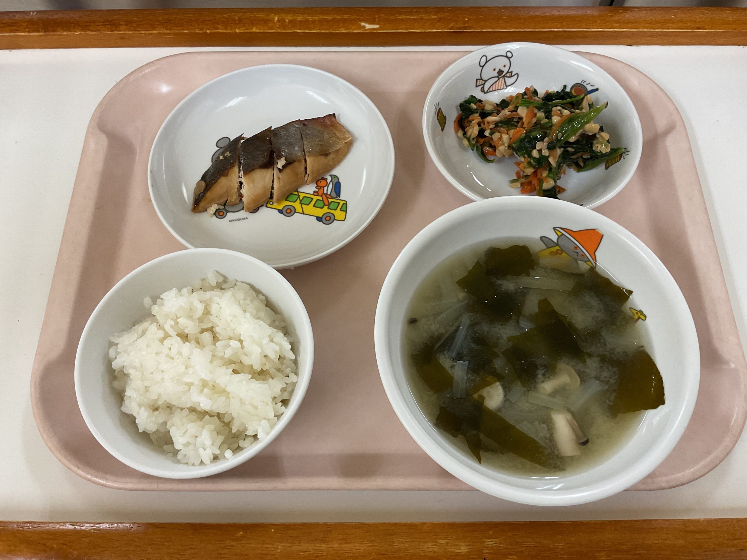 〈給食〉ぶりの照り焼き、ごはん、ほうれん草の納豆和え、わかめと玉ねぎのみそ汁。