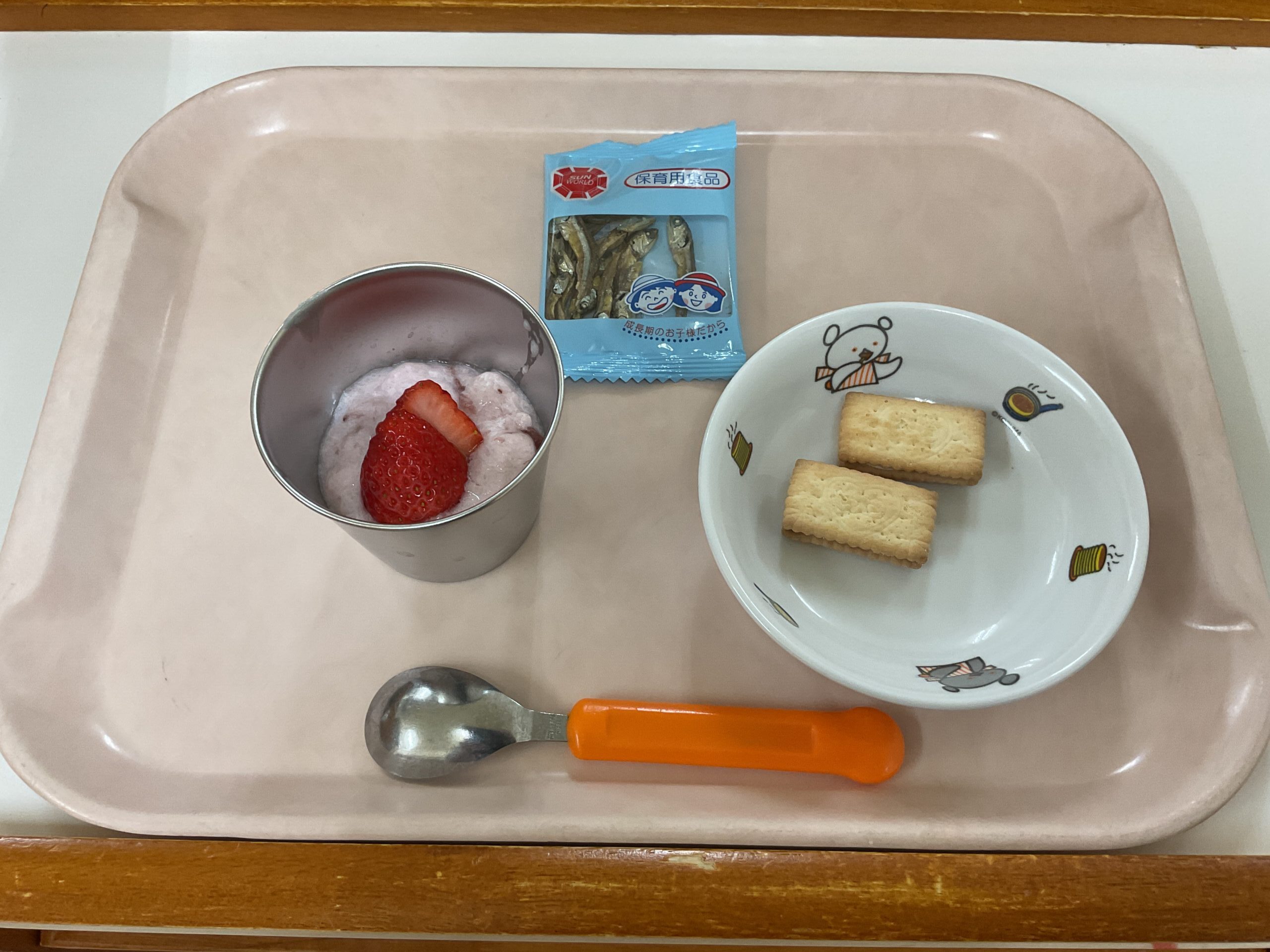 〈午後のおやつ〉いちごフルーチェ、味付け小魚(以上児)、ビスコ(未満児)。