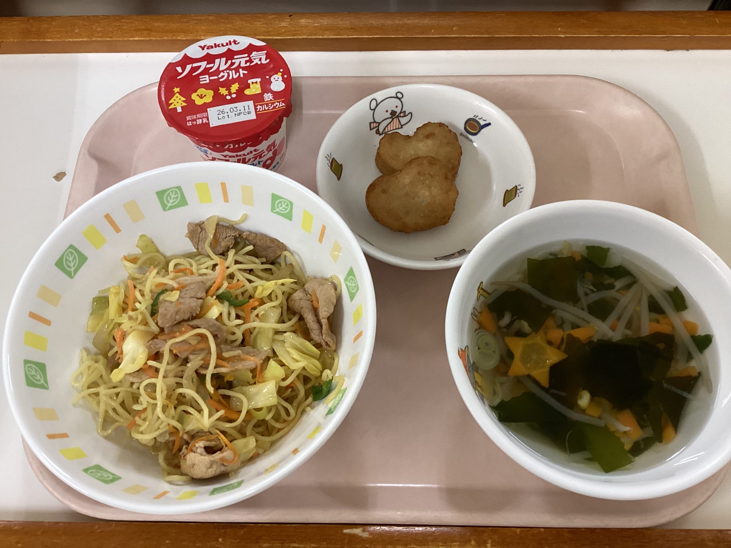 〈給食〉焼きそば、チキンナゲット、わかめともやしのスープ、ソフール元気ヨーグルト。